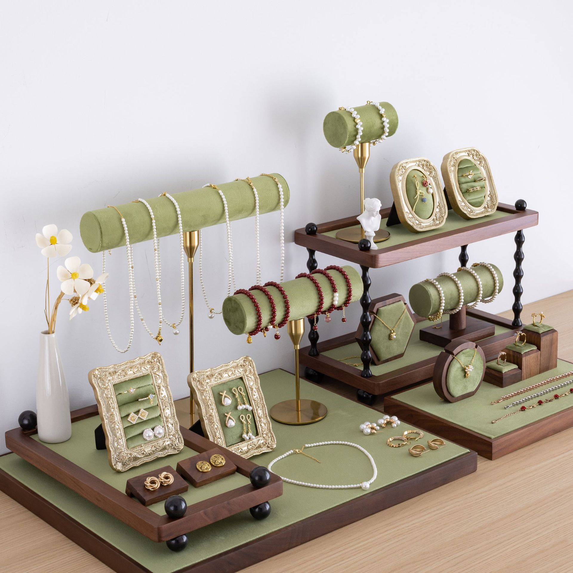 绿色绒布首饰展示架胡桃木饰品双层托盘项链手串挂架珠宝收纳套系