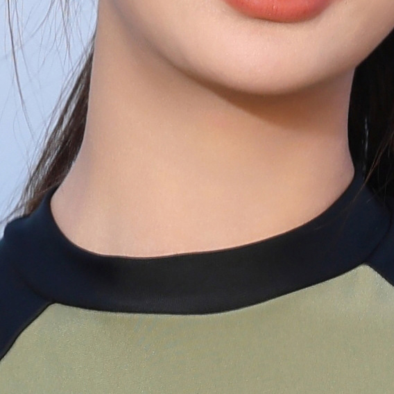 新型水着の女性は体を分けて平角で保守的で痩せています。