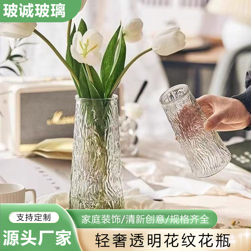 2025新款简约大号透明花纹花瓶水养富贵竹桌面客厅插花摆件客厅