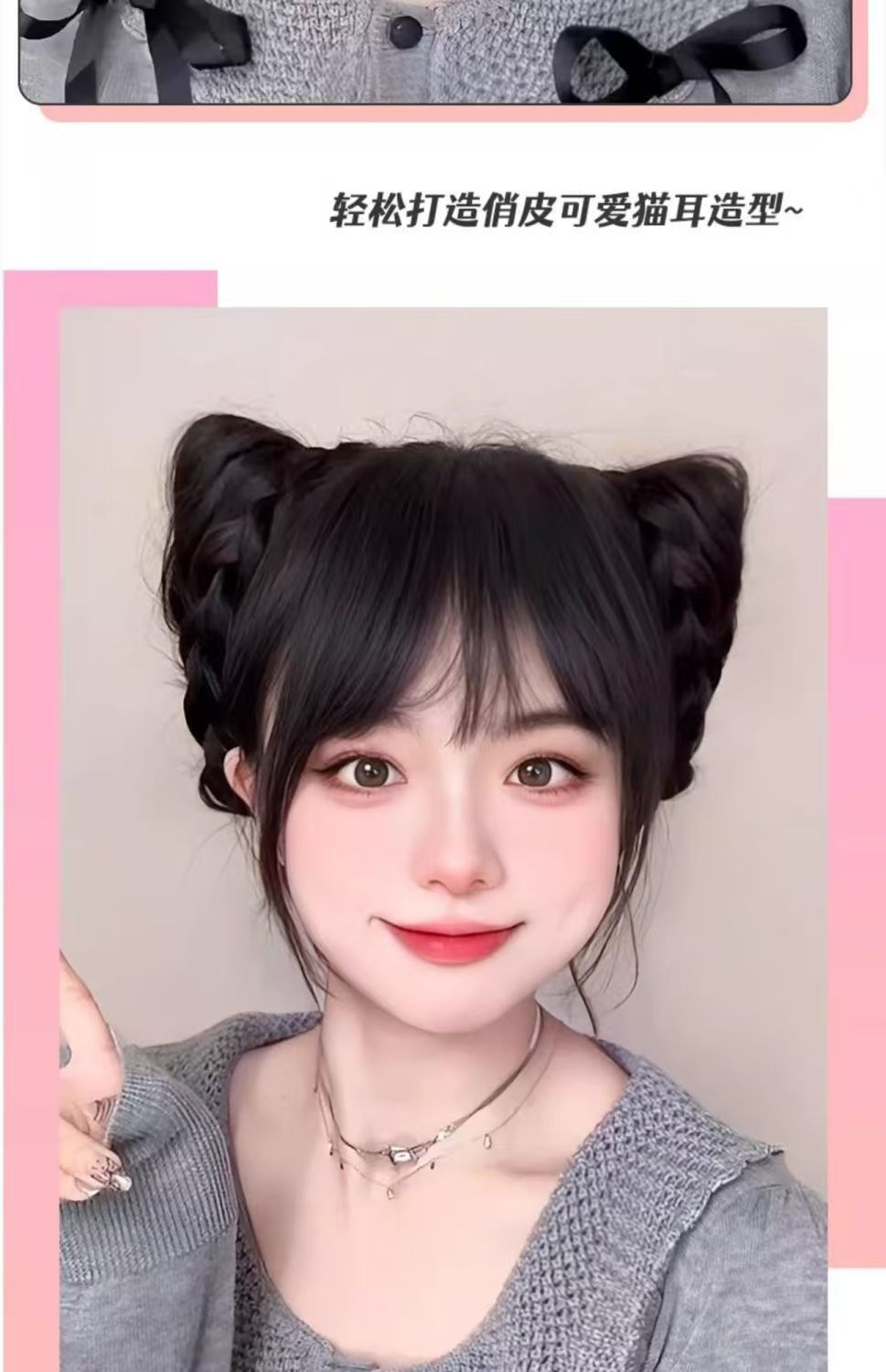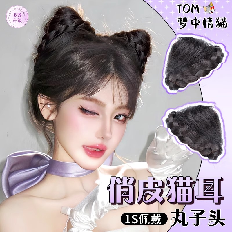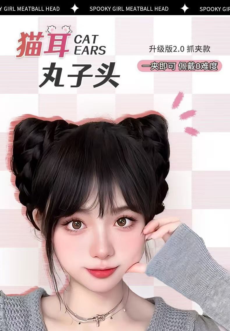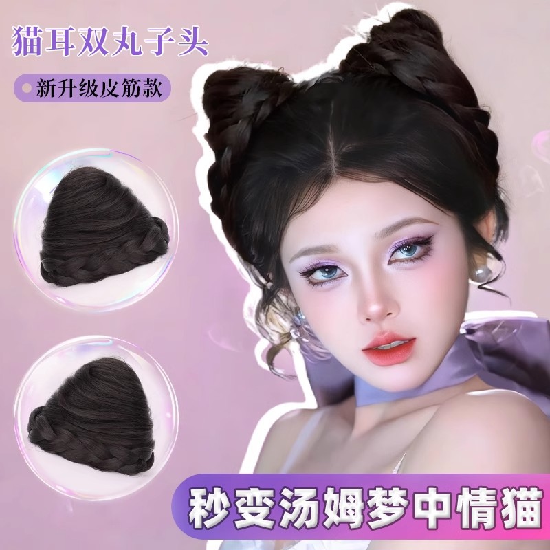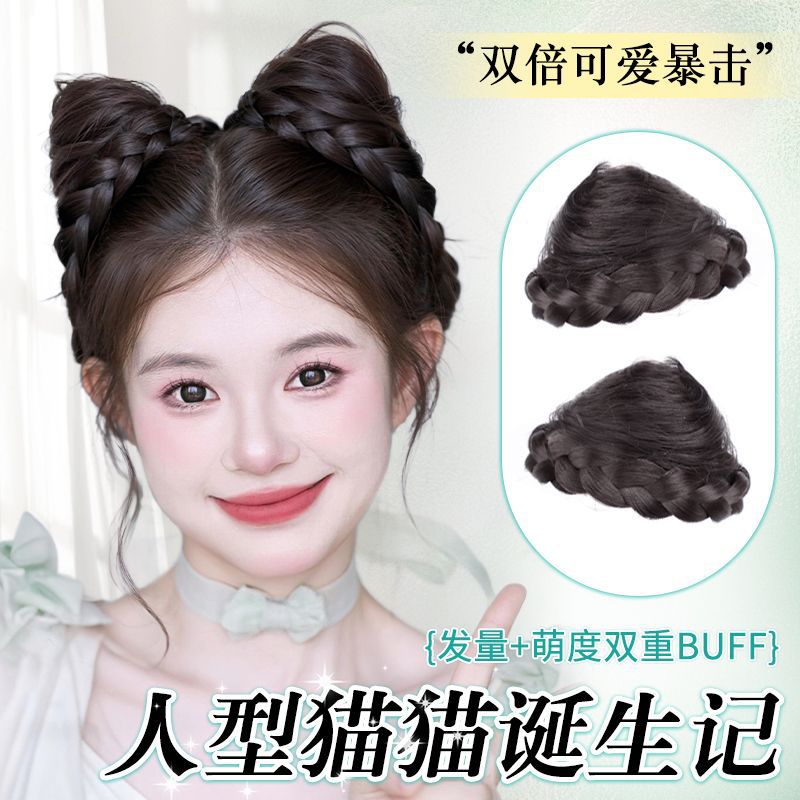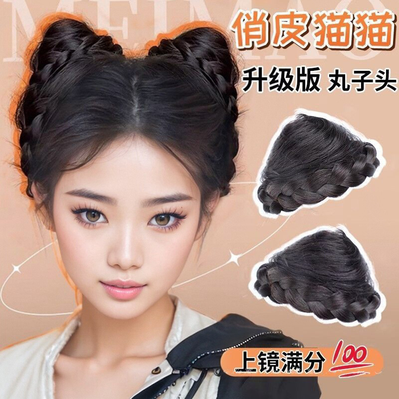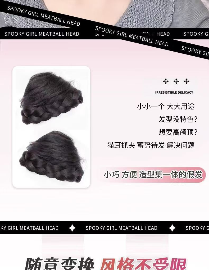 鸿秀优选-升级假发辫子猫耳朵抓夹发包可爱双丸子头发饰盘发花苞