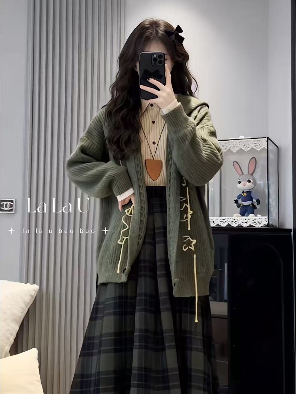 重工慵懒风绿色牛角扣毛衣开衫外套女秋冬设计感连帽浣熊绒针织衫