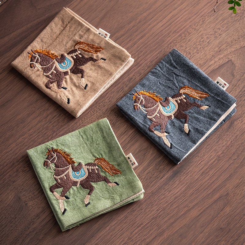 复古棉麻刺绣马到成功茶巾茶桌布抹布艺吸水茶垫隔热垫茶道零配件