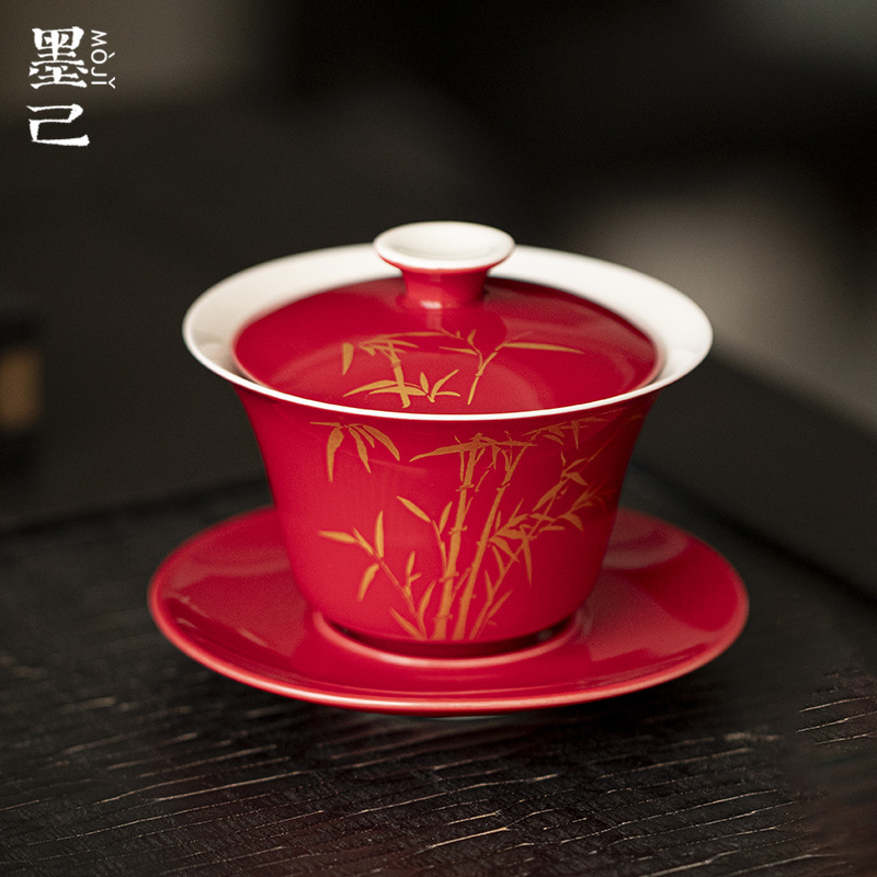 墨己郎紅箔押し三才蓋杯工夫茶道具陶磁器家庭用敬茶わんお茶茶碗文人器蓋碗
