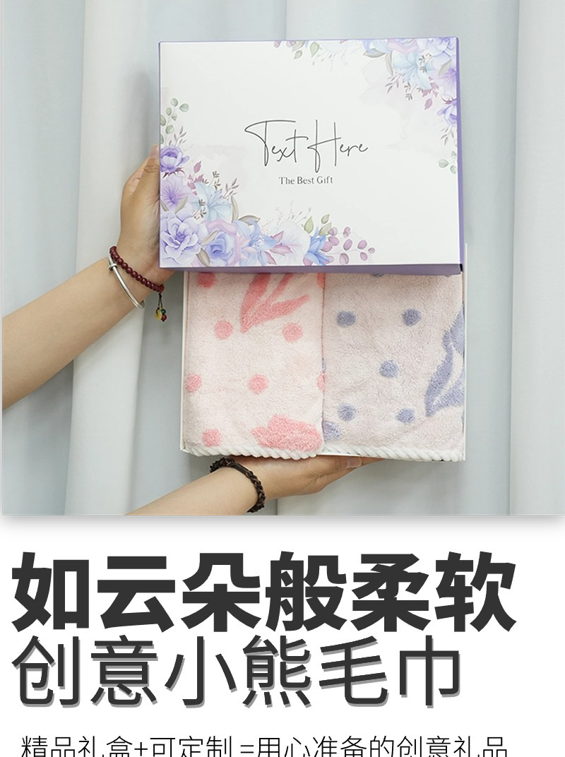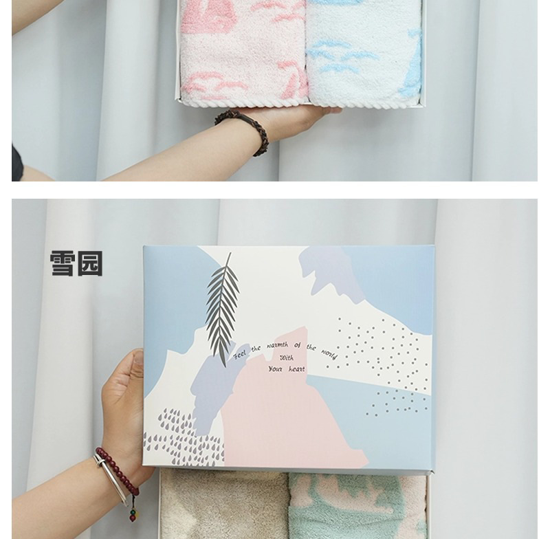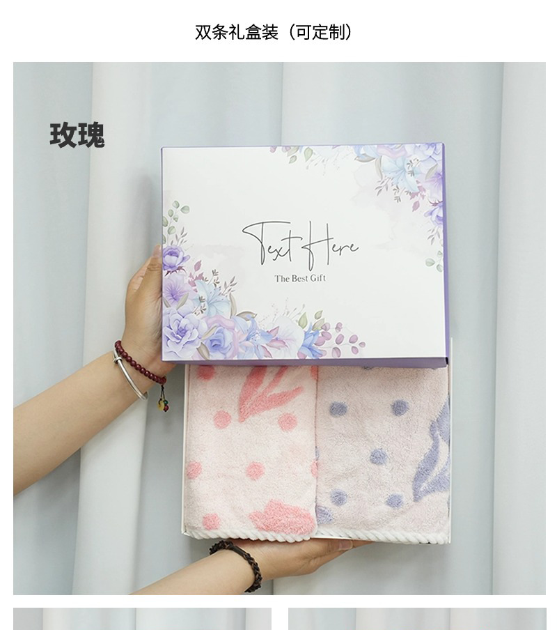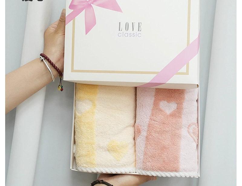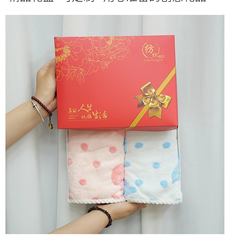 サンゴのベルベットのタオルを2枚入れたギフトボックスには、結婚祝いのプレゼントタオルが入っています