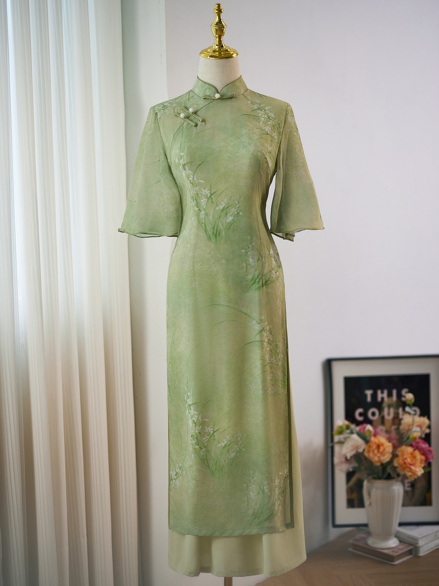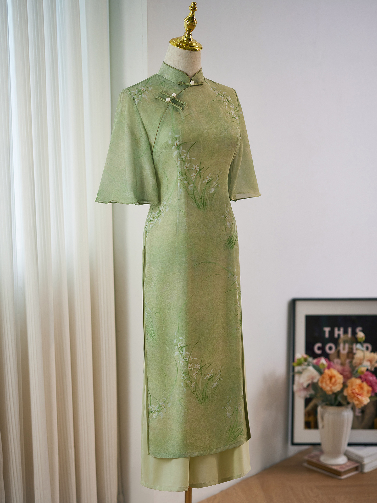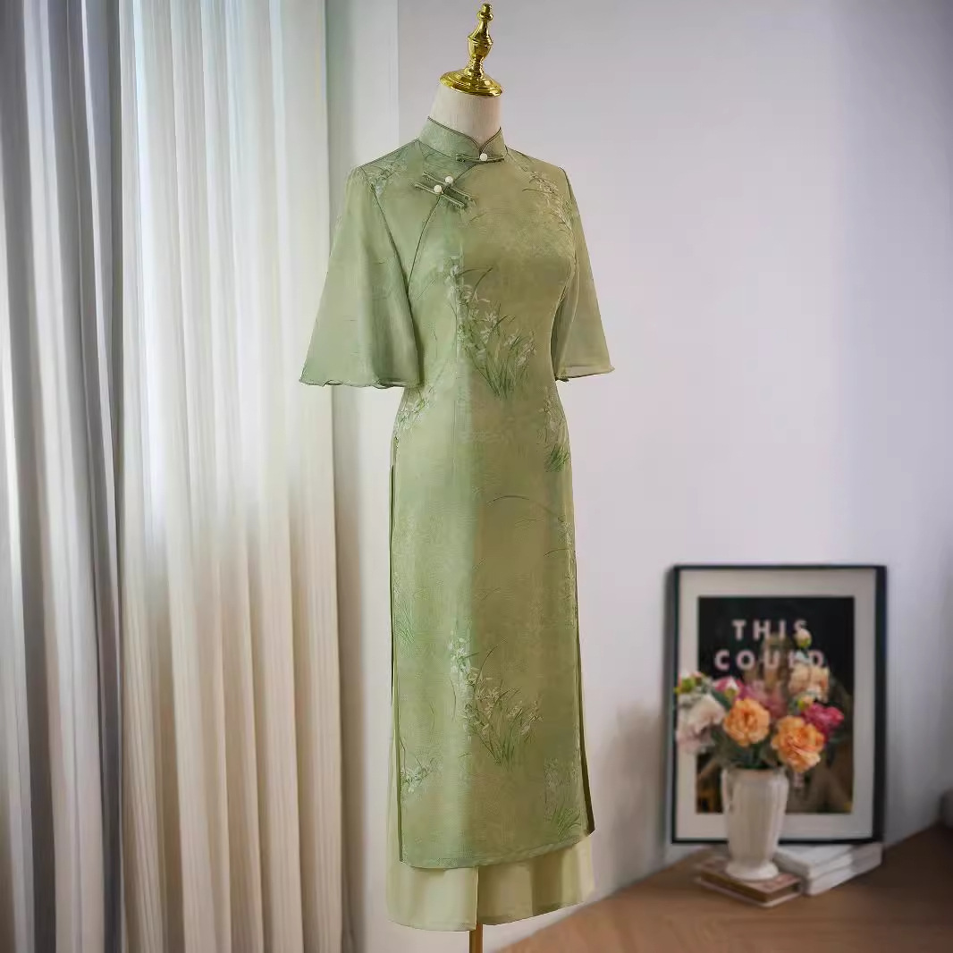 緑色の旗袍2025年新作夏新作中国風改良版若い女の子向けオーディ茶服蘭柄大学受験用