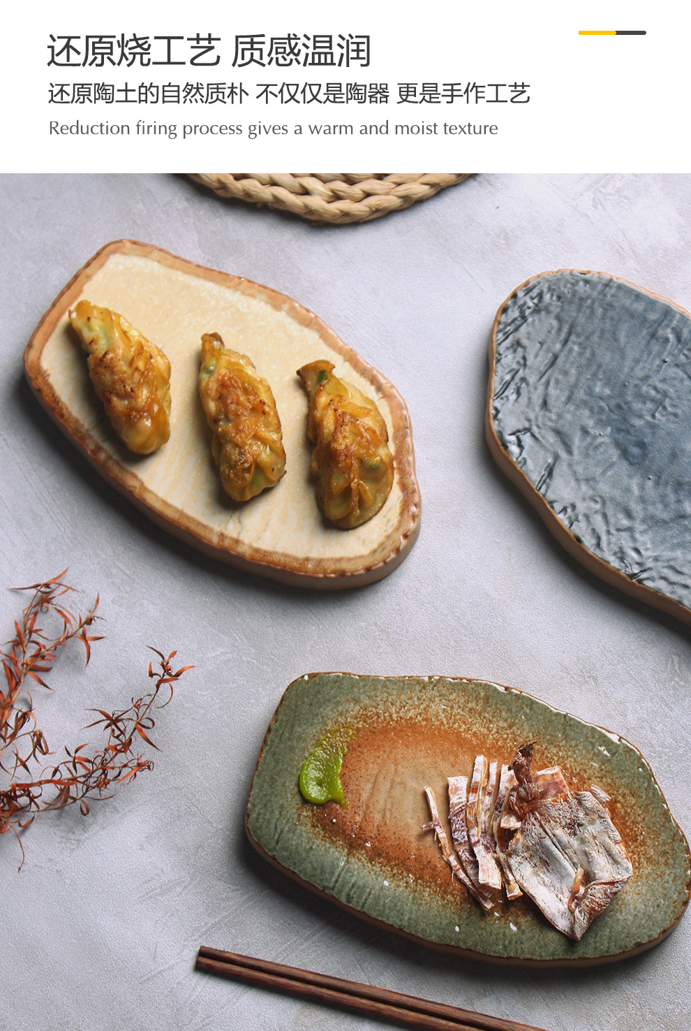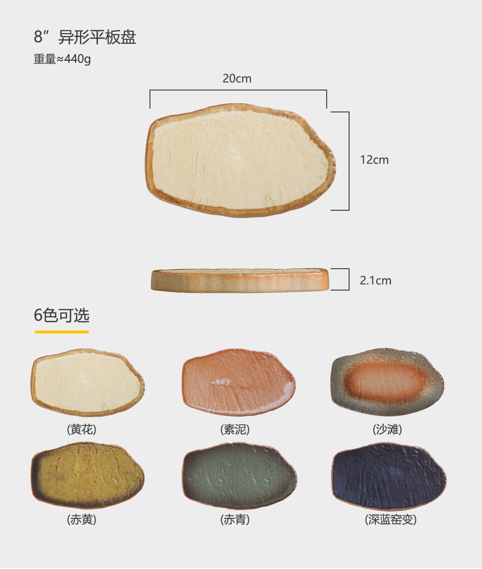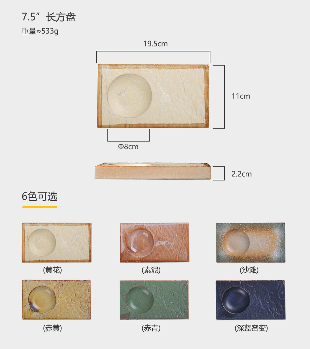 カラー 7.5」長方盤-赤黄,7.5」長方盤-赤青,7.5」長方皿-黄花,7.5」長方盤-砂浜,7.5」長方皿-深藍窯変,7.5」長方皿-素泥,8 ”異形プレートプレート-赤黄,8 ”異形プレートプレート-赤青,8 "異形の平板の皿-黄色の花,8 "異形プレート-ビーチ,8」異形平板皿-深藍窯変,8」異形プレート皿-素泥