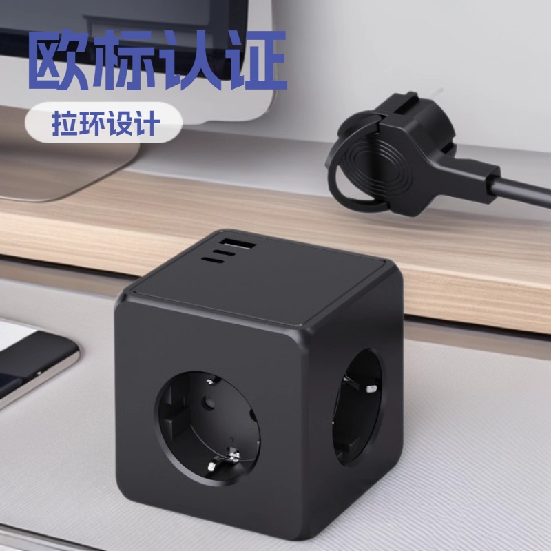 亚马逊欧规魔方插座插排拉环插头带USB快充桌面排插办公接线插板