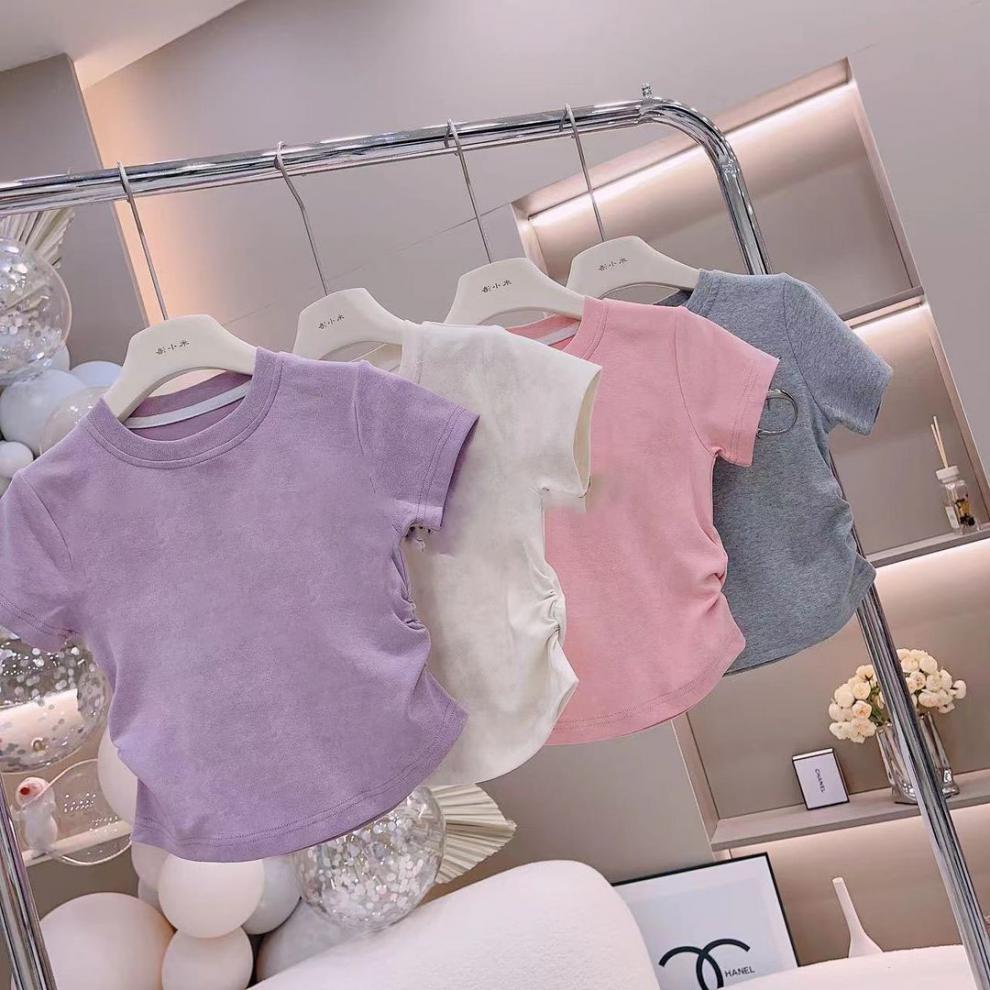 子供用半袖レディース2024新作人気スタイルコットンTシャツ、無地、シンプル、多用途、ファッショナブルな巾着トップス、女性用ネックカバー付き
