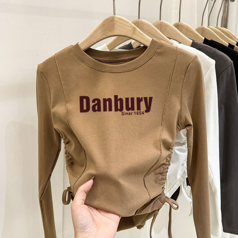 女の子用長袖Tシャツ、新作おしゃれトップス、子供用韓国風インナーレタープリント、スリムフィット春秋ショート丈トレンド子供服