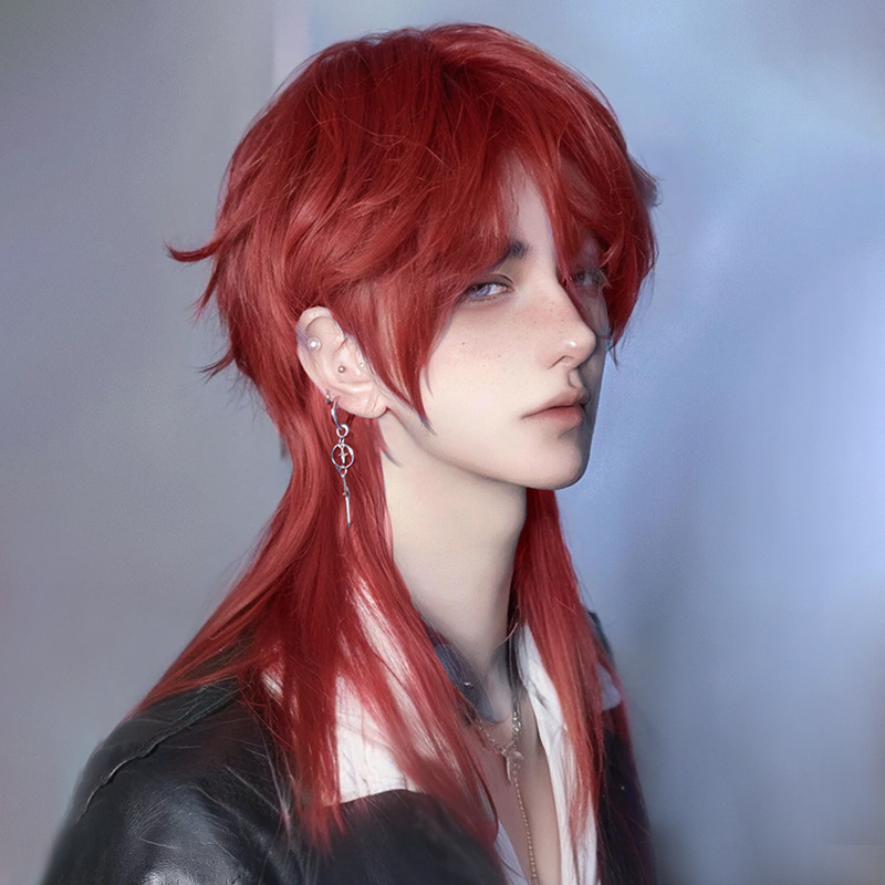 狼尾鲻鱼头红色假发男生款自然无痕短发少年cos男士拖尾全头套