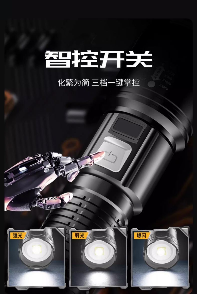 懐中電灯led屋外強光充電アルミ合金三速ズーム遠射強光懐中電灯帯充電