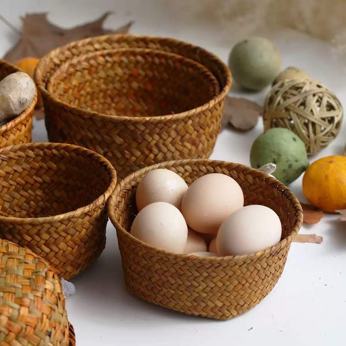 天然海草編み収納かごキッチン姜にんにく収納かごトランペット円形玄関デスクトップ雑物収納かご