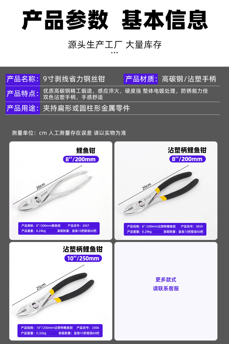 型番 鯉魚鉗(箱入り10本、ケース入り60本),8inch プラスチックハンドル鯉ペンチ (1 箱に 10 個、1 箱に 60 個),10inch プラスチックハンドル鯉ペンチ (1 箱に 10 個、1 箱に 60 個)