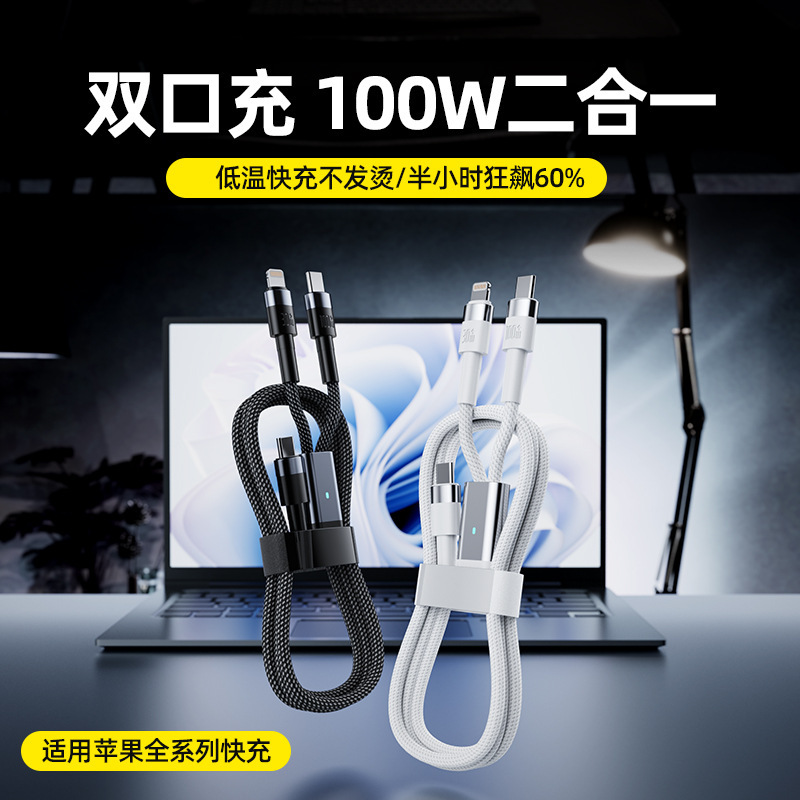 PD快充一拖二数据线100W二合一快充线适用华为苹果16type-c充电线