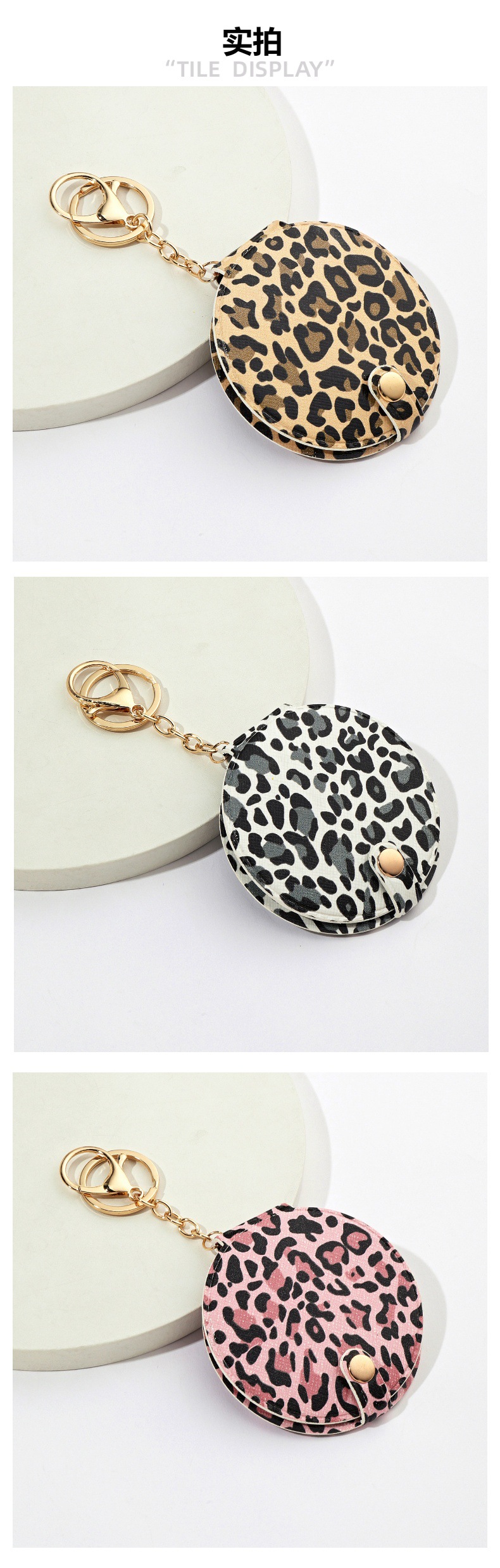 小さい桃の心のヒョウの紋様の鏡のキーはpu皮革の愛の化粧の鏡のキーチェーンを掛けてクロスボーダーの生放送の小さいプレゼントを掛けます。