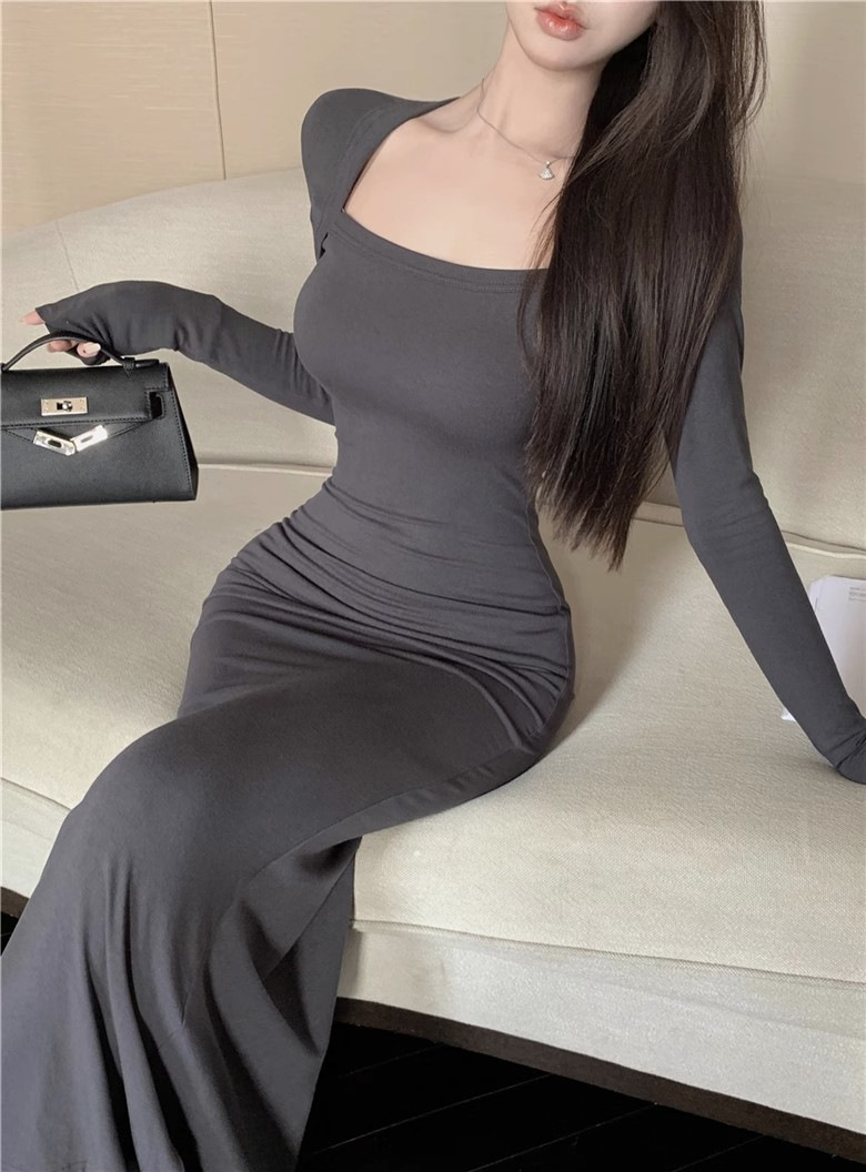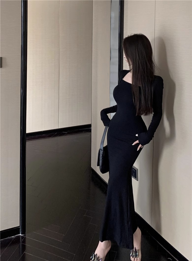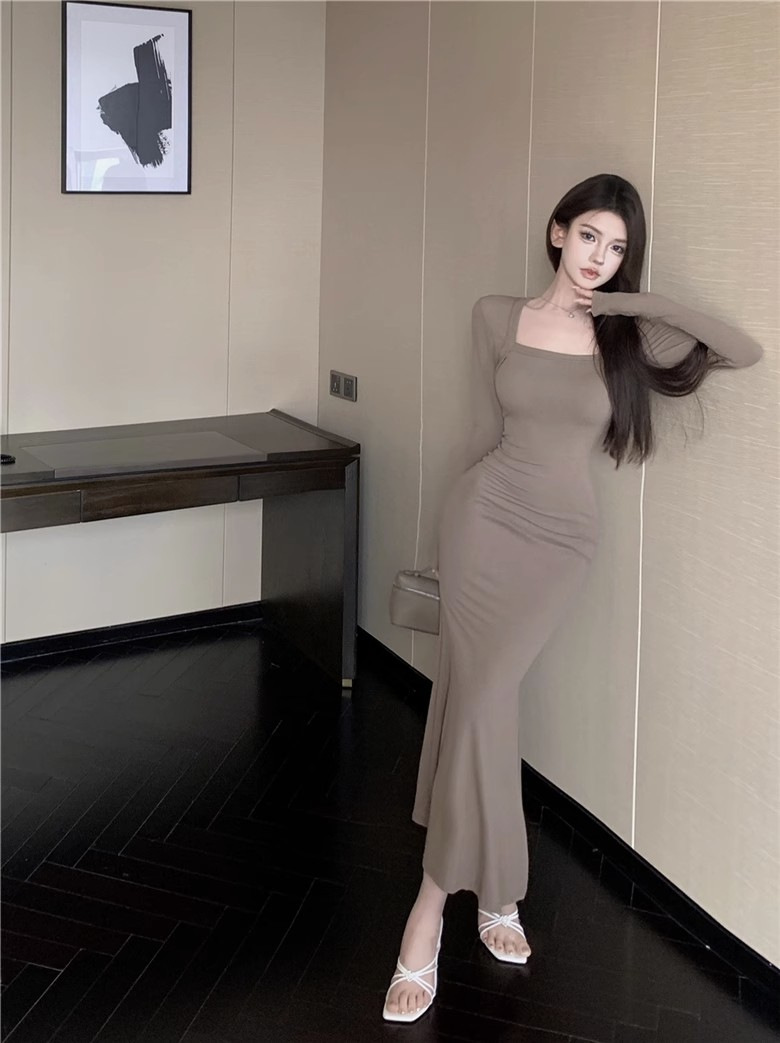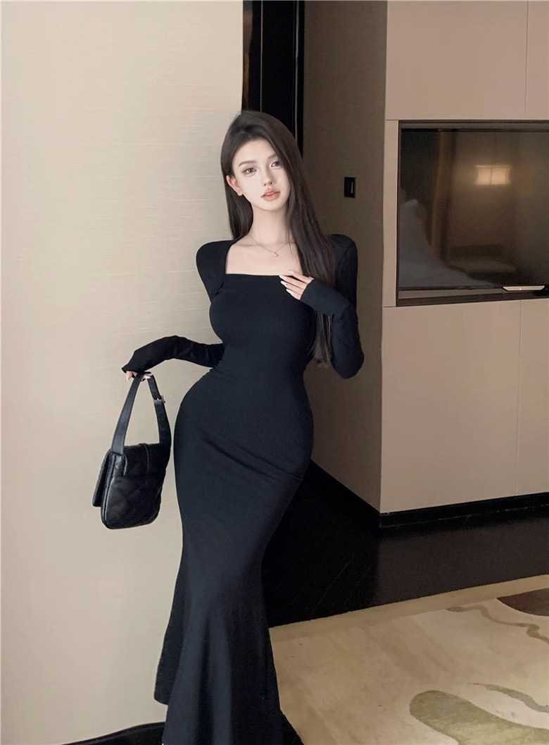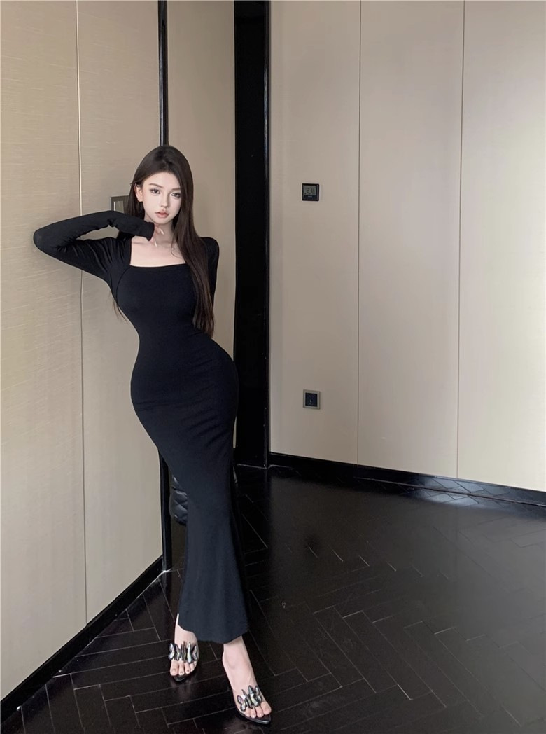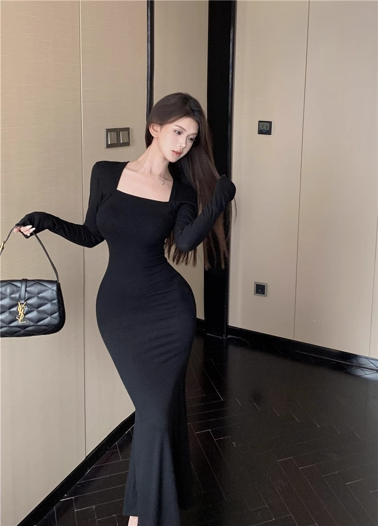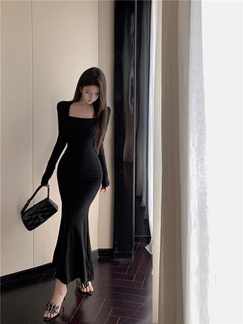 秋冬甜辣方领打底包臀小妈裙设计感中长款包臀鱼尾裙内搭连衣裙女