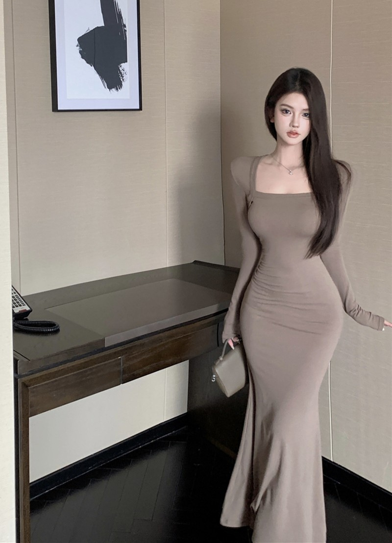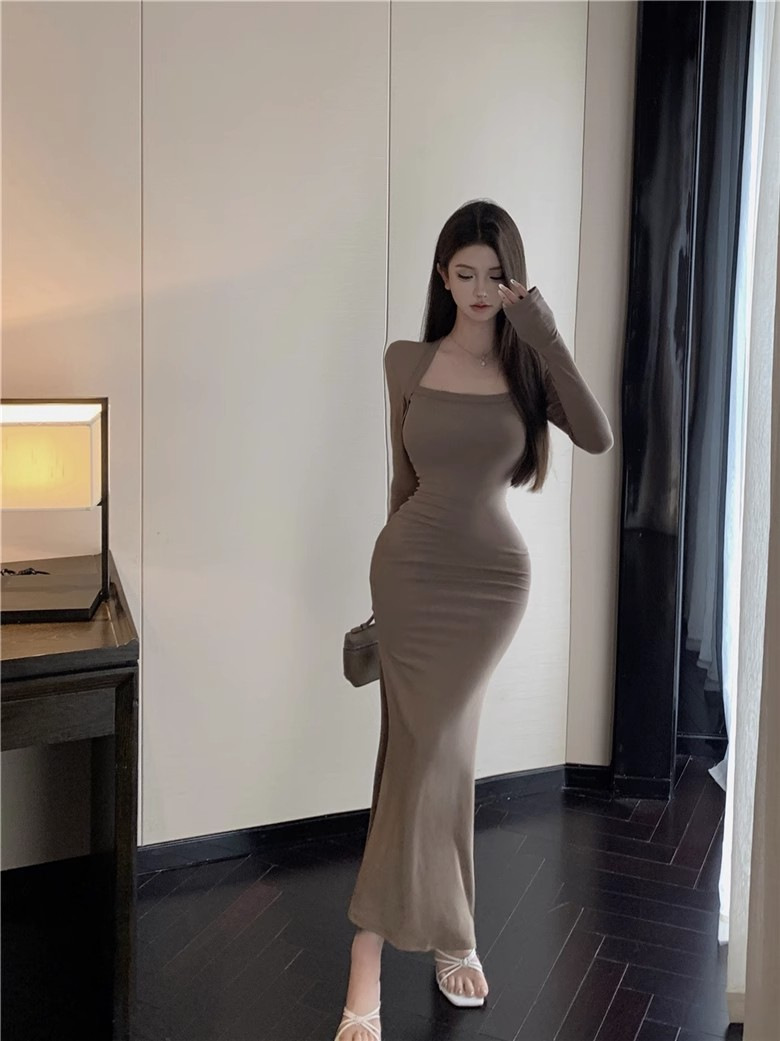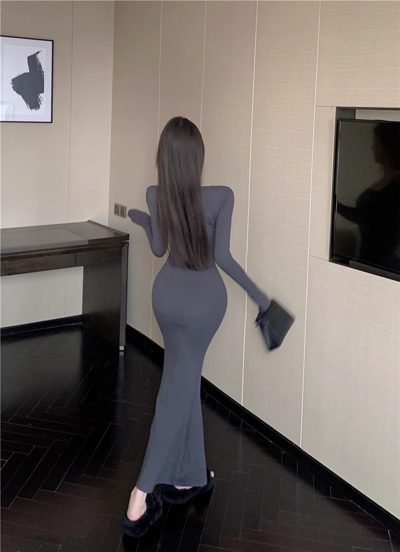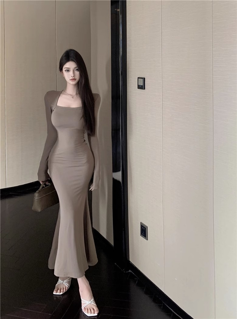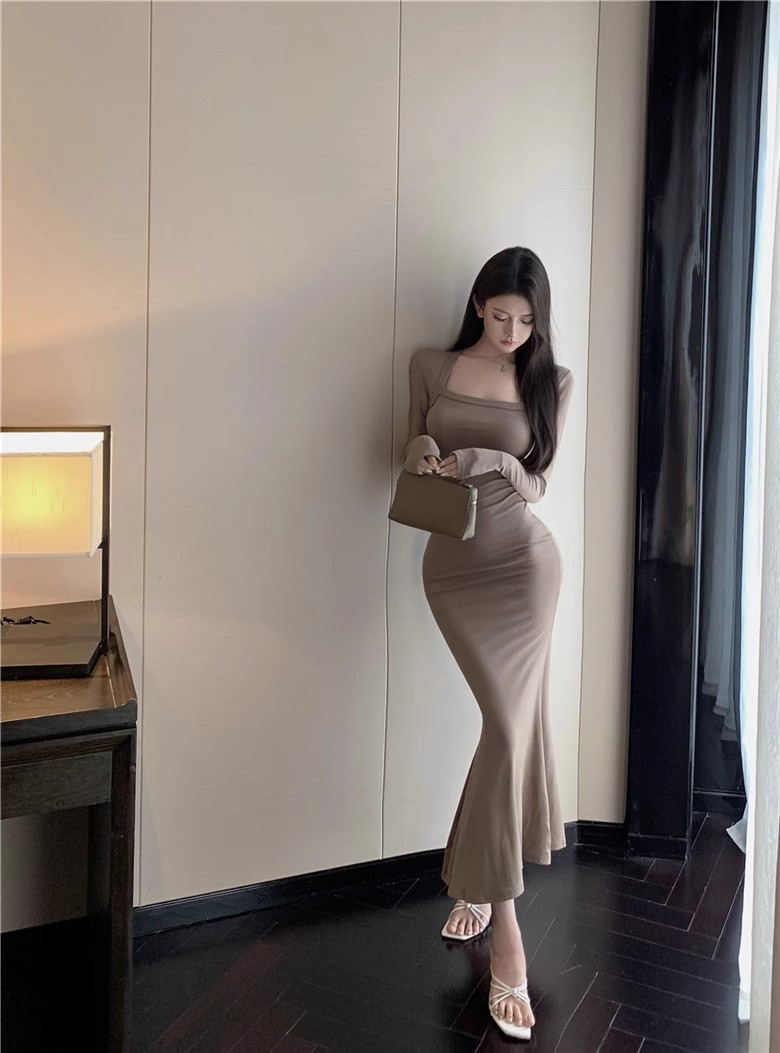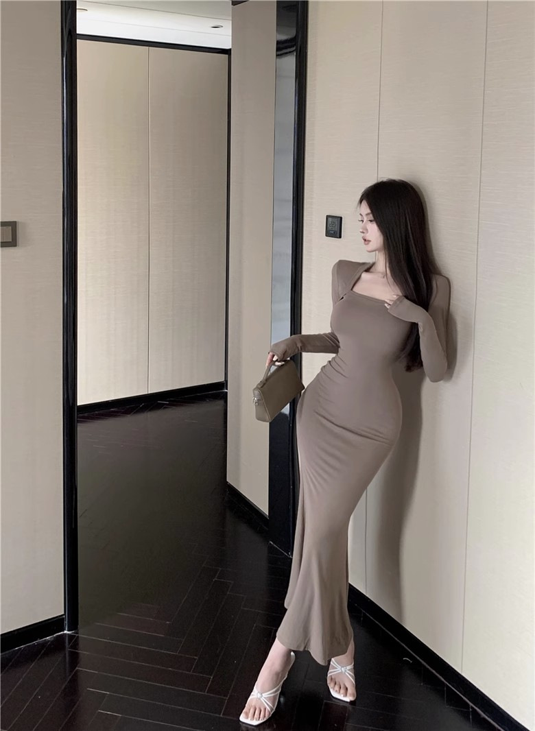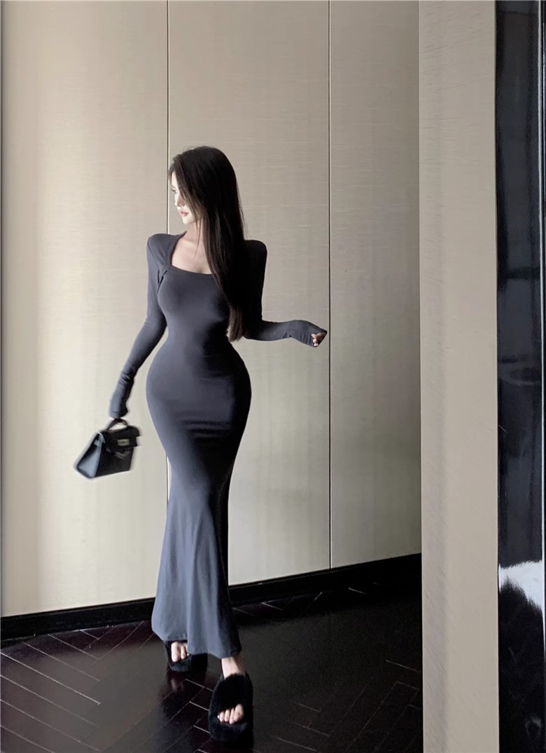 秋冬甜辣方领打底包臀小妈裙设计感中长款包臀鱼尾裙内搭连衣裙女