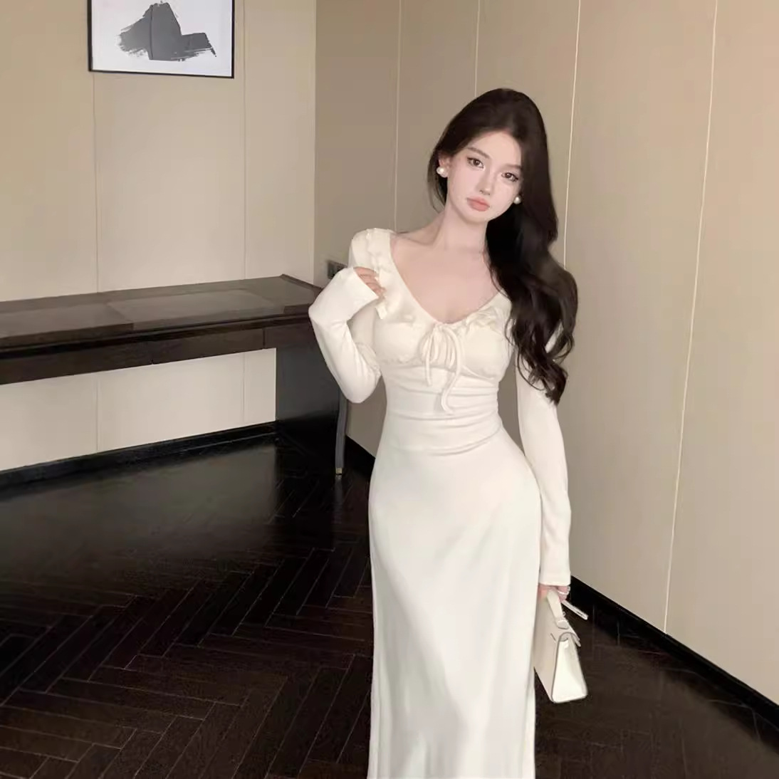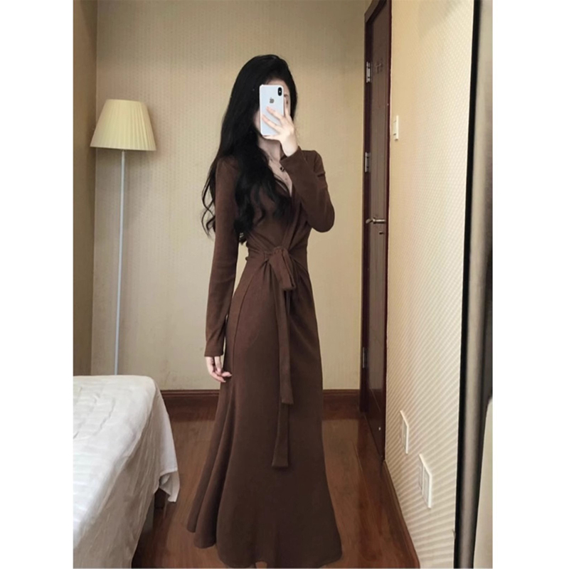 レトロな純色のワンピース女性秋冬長袖修身底付きスカート