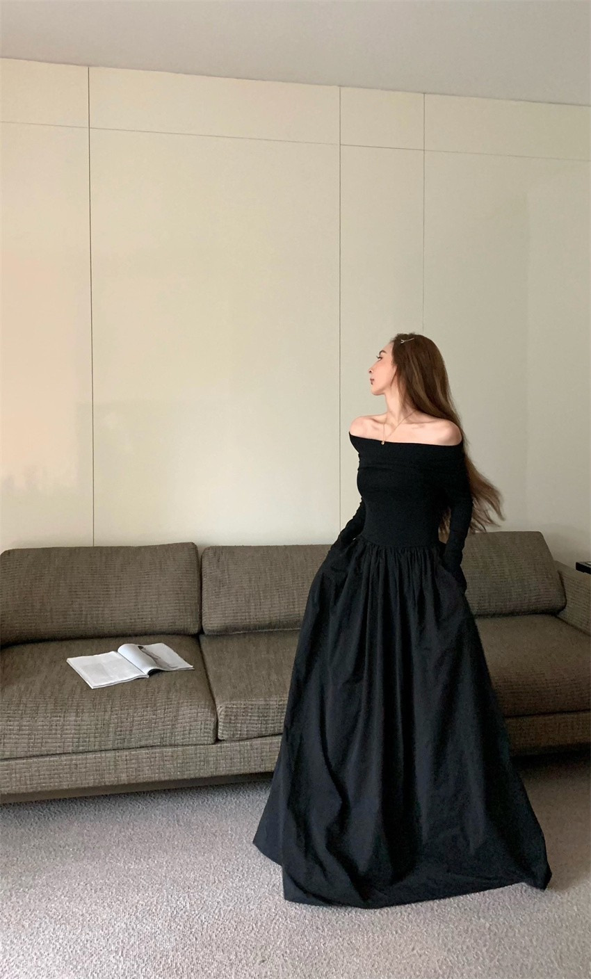 レトロ感のある黒い一字の肩のワンピースの女性は秋冬に底を打って中に長いスカートを掛けて腰の気質のa字のスカートを収めます。