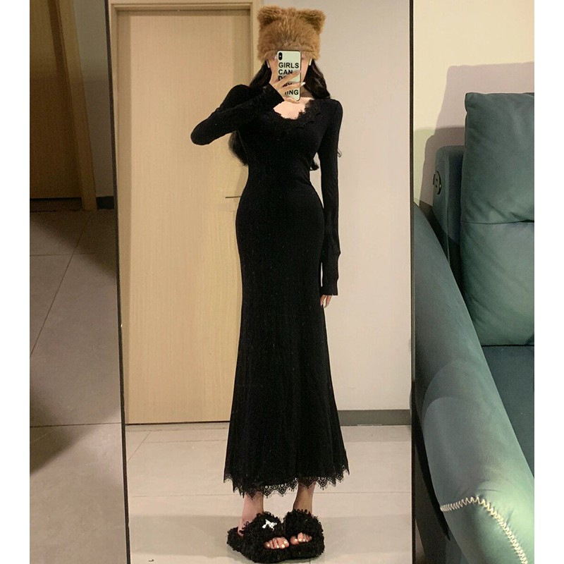 黒いレースのvネックのニットの魚の尾のワンピースの女性の秋冬の年会の軍服の中で底を打ってお尻の長いスカートを包みます。