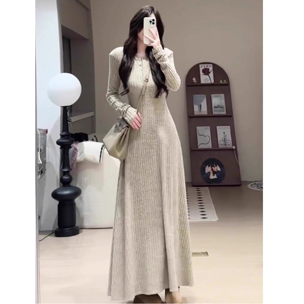 磨毛坑条针织内搭连衣裙女初秋季2025早秋新款高级感收腰长款裙子