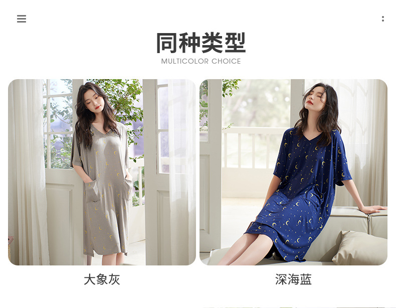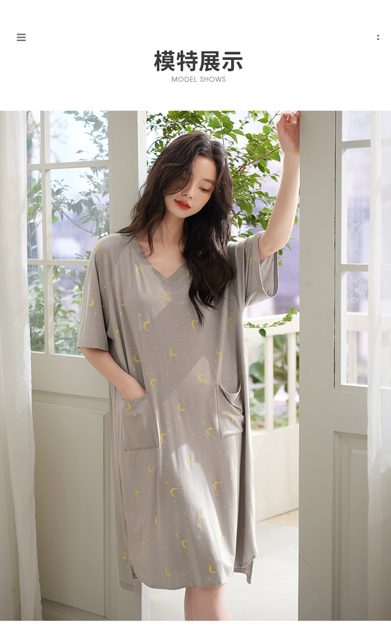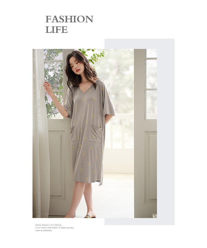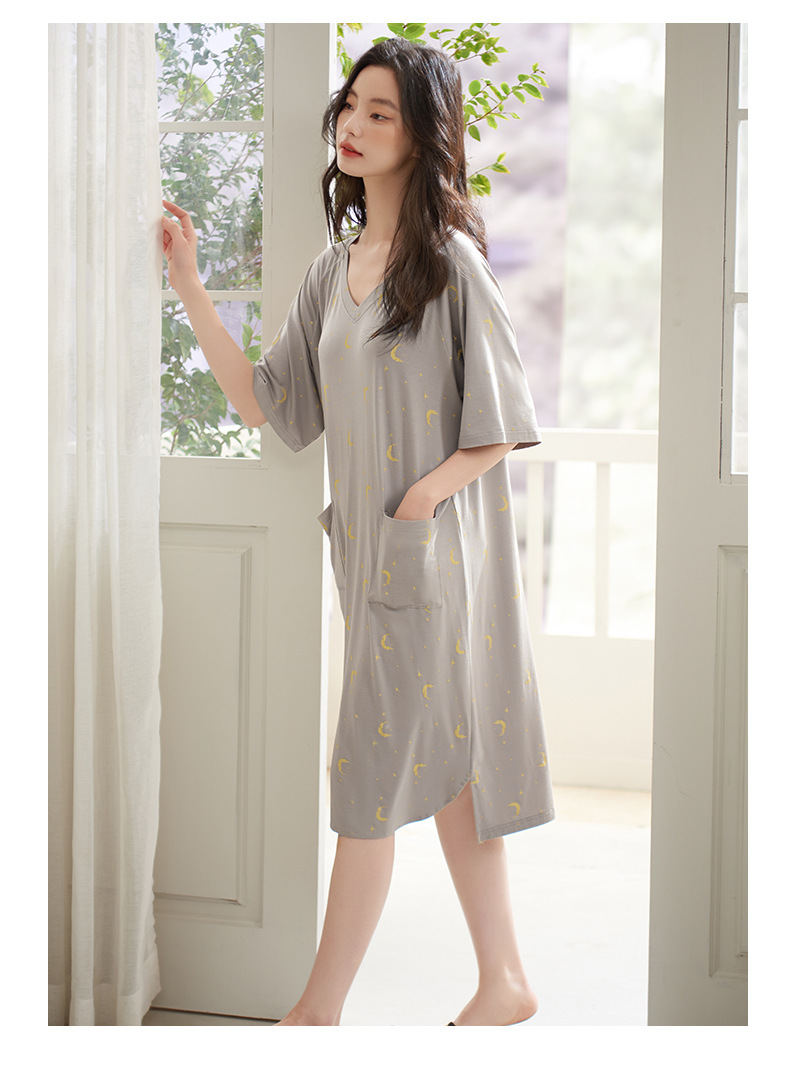 春夏ホームウェアレディースプルオーバーVネック8分袖膝丈ミドル丈シンプルモーダルウェアラブルナイトガウンパジャマ