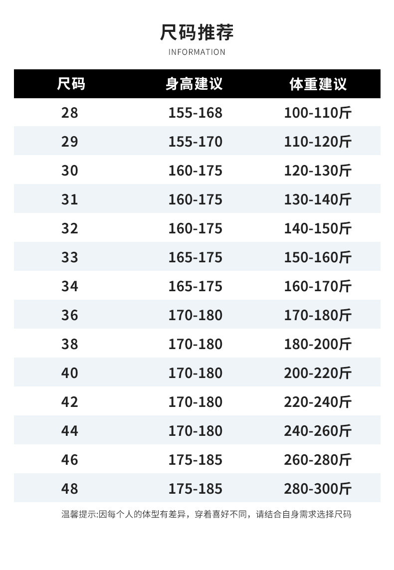 サイズ 28提案 (100-110)斤,29推奨 (110-120)斤,30アドバイス (120-130)斤,31提案 (130-140)斤,32推奨 (140-150)斤,33提案 (150-160)斤,34提案 (160-170)斤,36提案 (170-180)斤,38提案 (180-200)斤,40アドバイス (200-220)斤,42提案 (220-240)斤,44提案 (240-260)斤,46提案 (260-280)斤,48アドバイス (280-300)斤