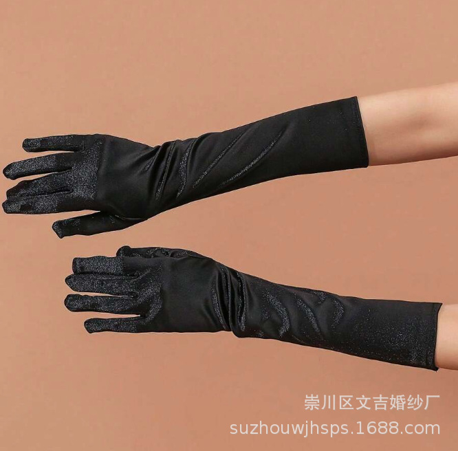 迪麗熱巴同モデルの黒いシルクの手袋の女性の長いウェディングドレスは腕のカバーの長いレトロで優雅な気質を撮影します。