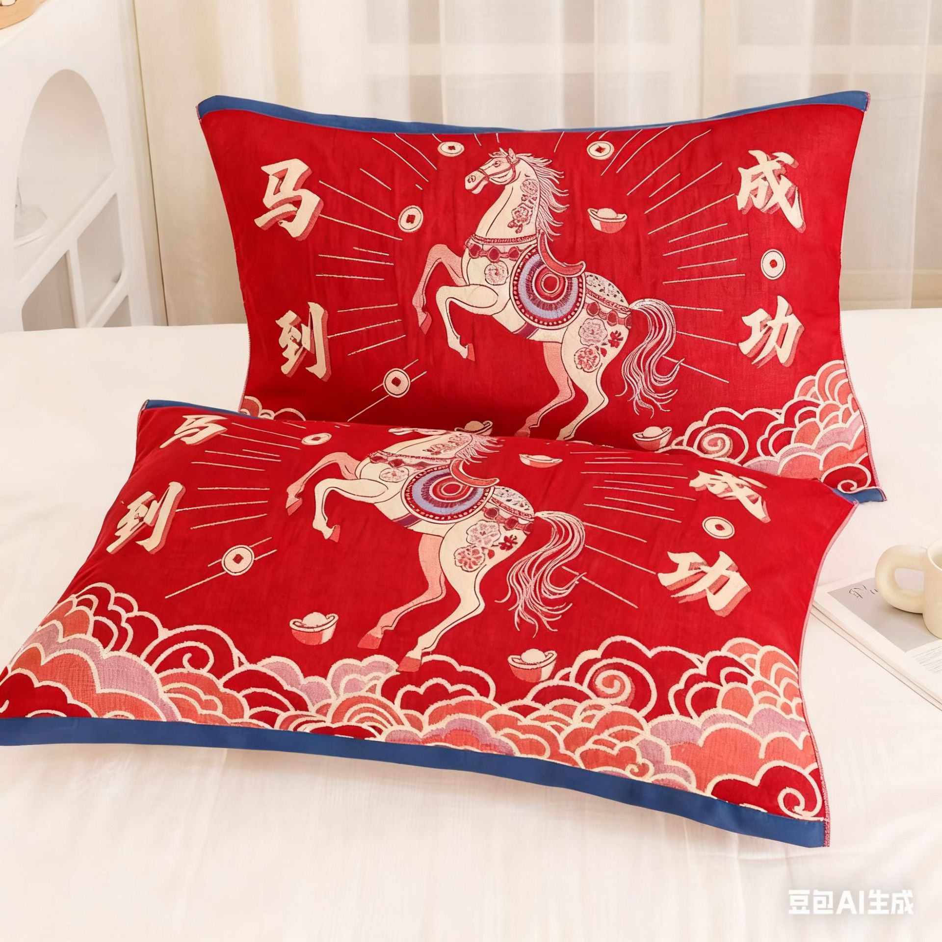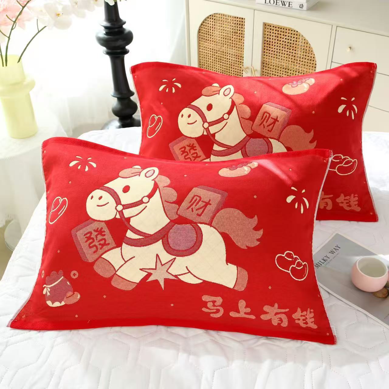 馬年のお祝いに、赤い純綿ガーゼ枕カバーのペアセット。高級感のある可愛い漫画柄、汗を防ぐ厚手の綿枕カバー。
