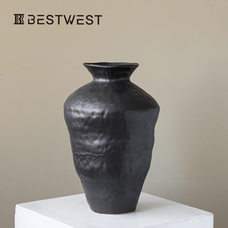 Best west大腹陶磁器花瓶創意デスクトップ置物中国式レトロ食卓ドライフラワー生け花器