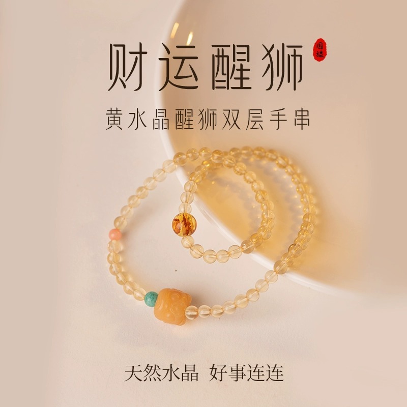 天然の黄水晶のブレスレットの双輪はライオンの菩提の手の串の数珠の水晶のカップルの手の串を刺して手をつけて男女を飾ります。