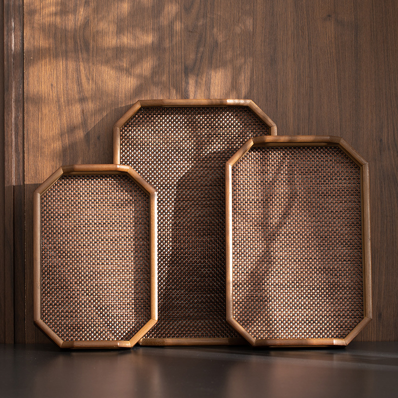 ティーセット、ティーカップ、フルーツ、高級スナックプレート、竹製プレースマット、八角形ハンドル付き家庭用ティートレイ