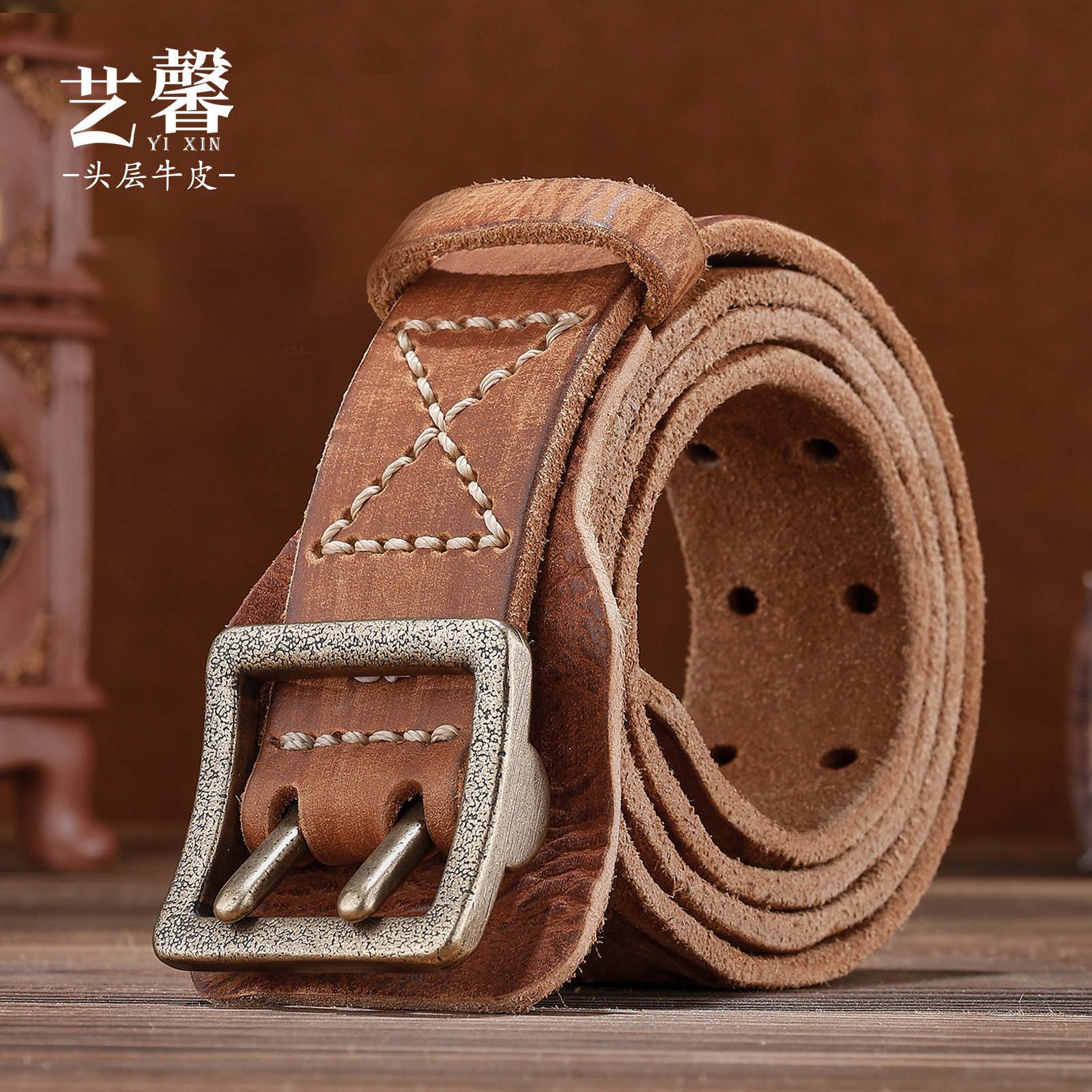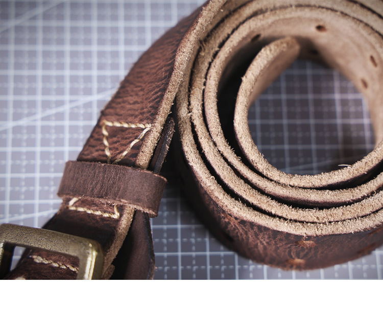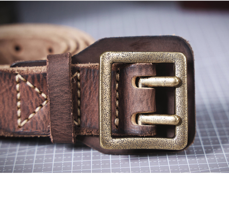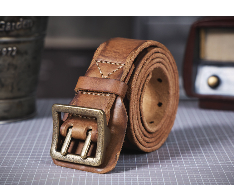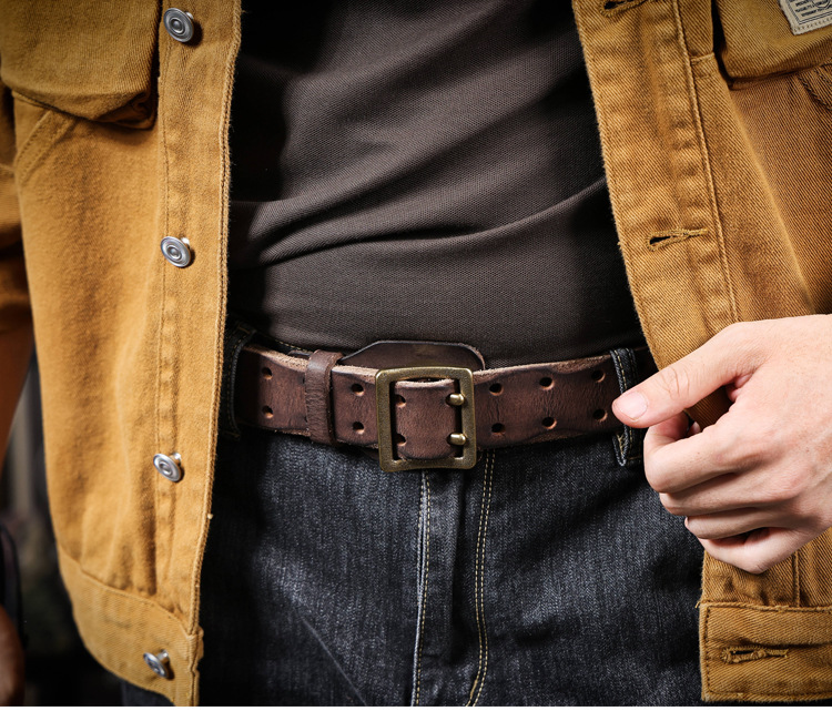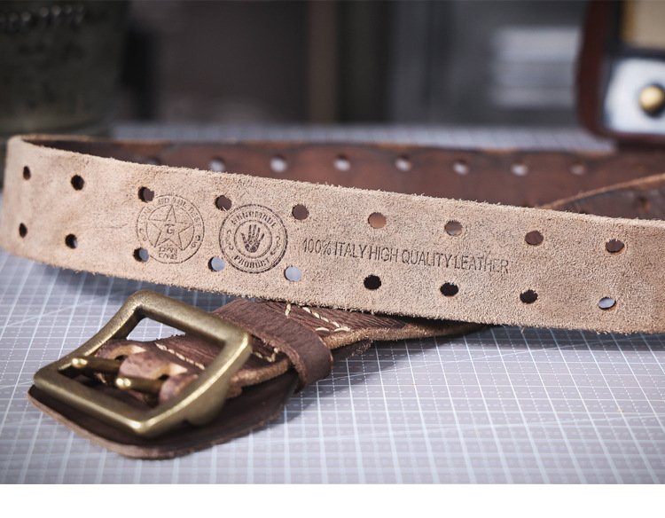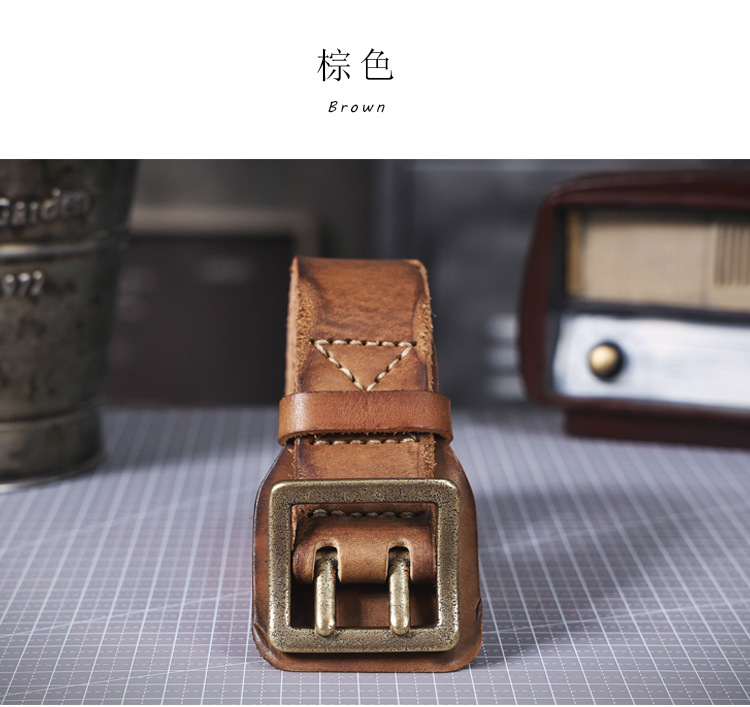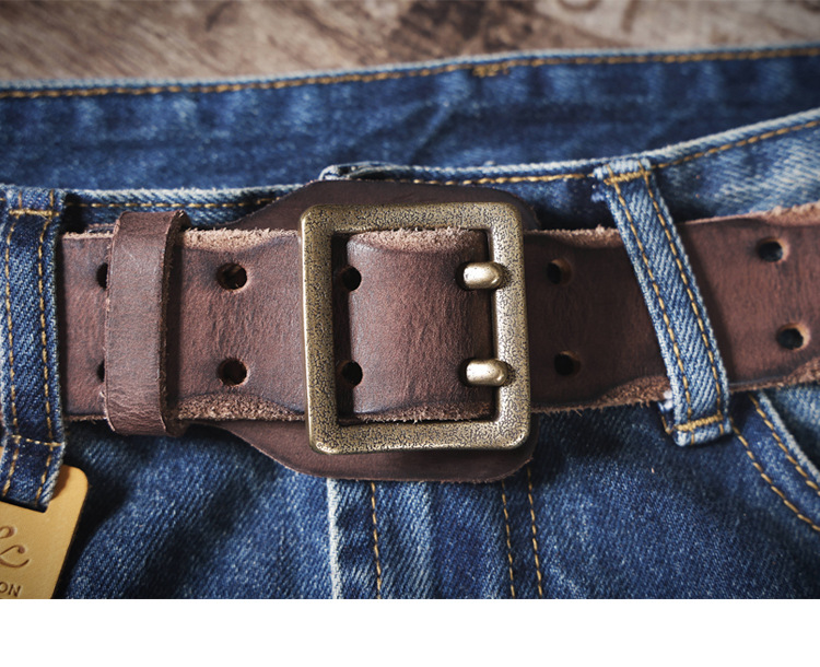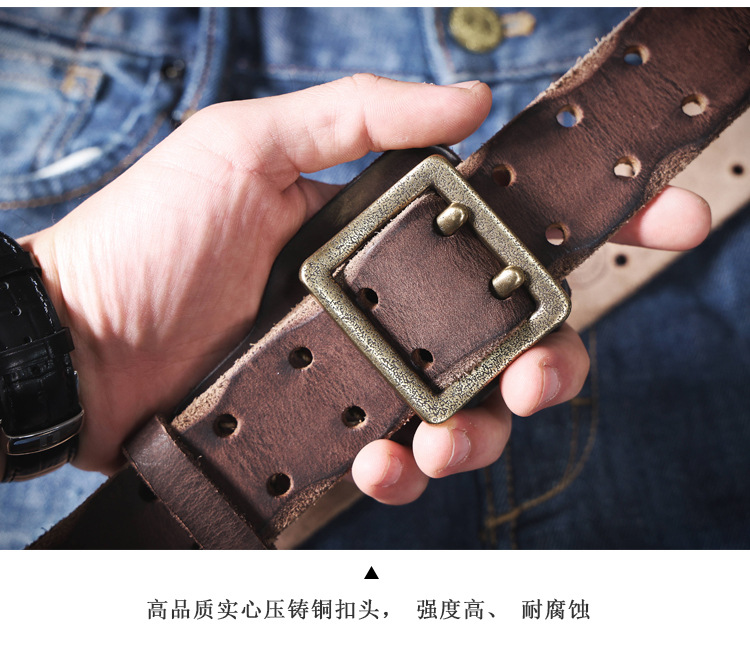 アメリカの厚いトップ層牛革男性銅ベルト双針ボタン復古手作りイタリア真皮ベルトシンプル