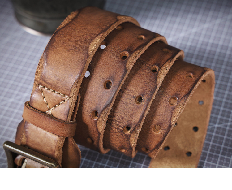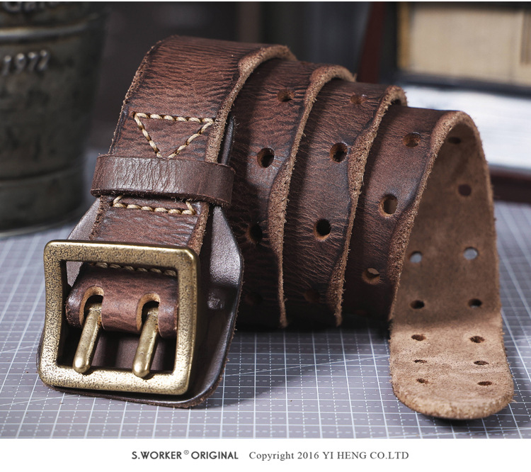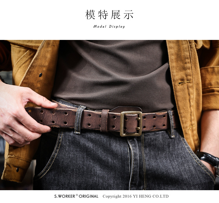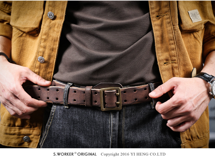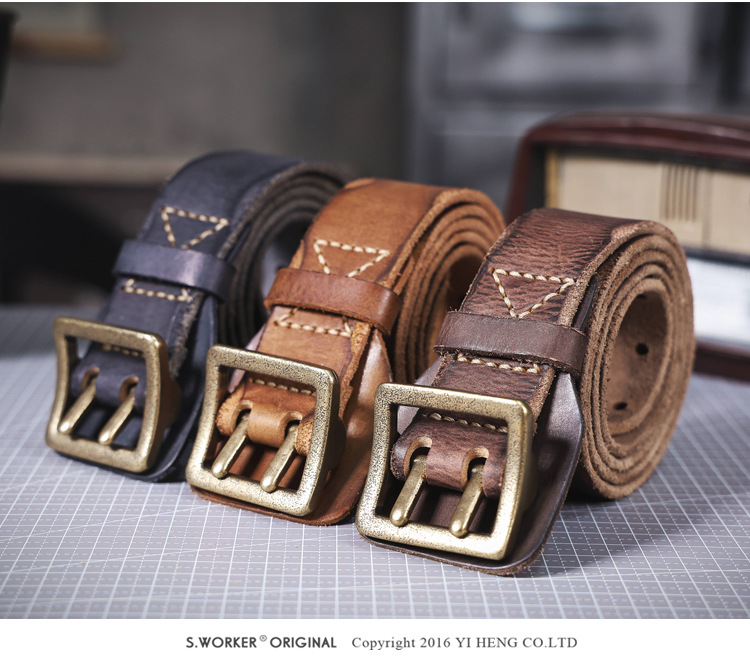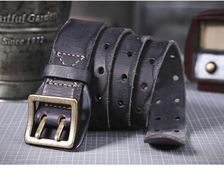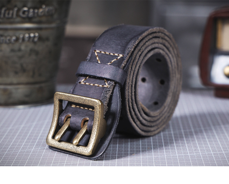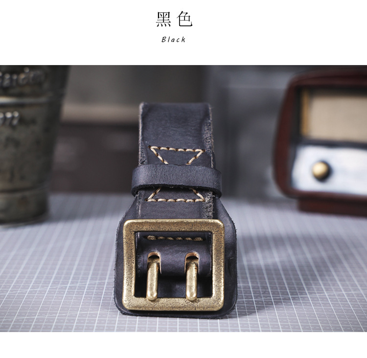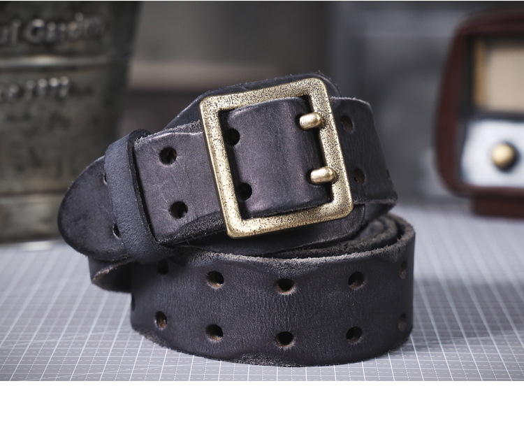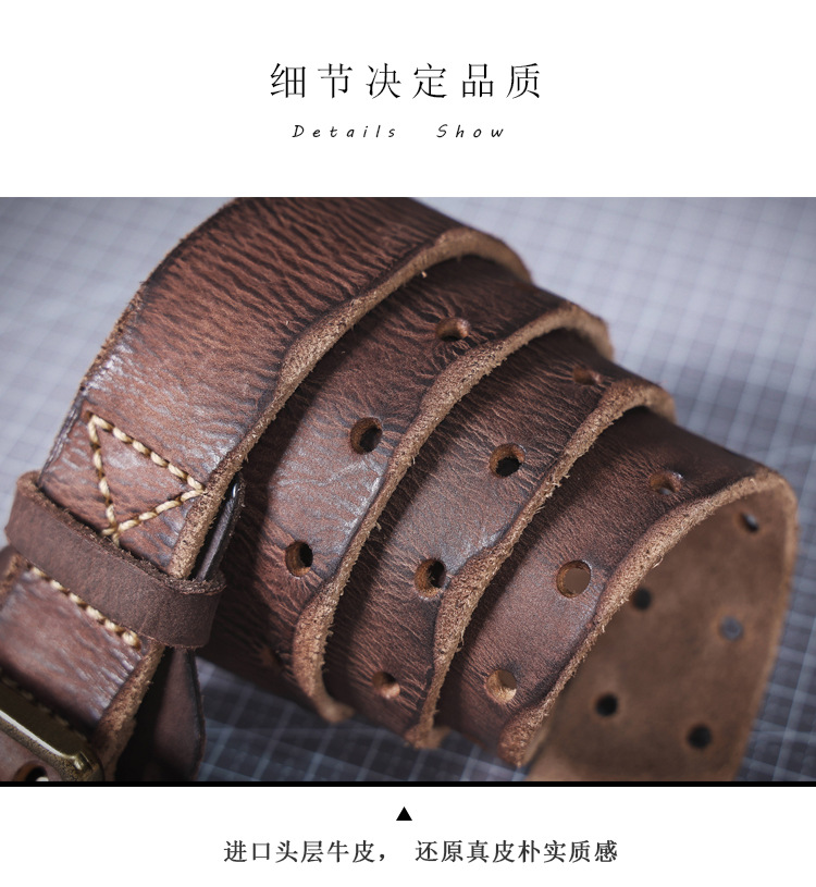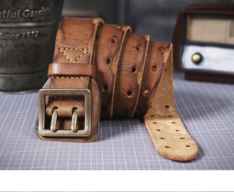 アメリカの厚いトップ層牛革男性銅ベルト双針ボタン復古手作りイタリア真皮ベルトシンプル
