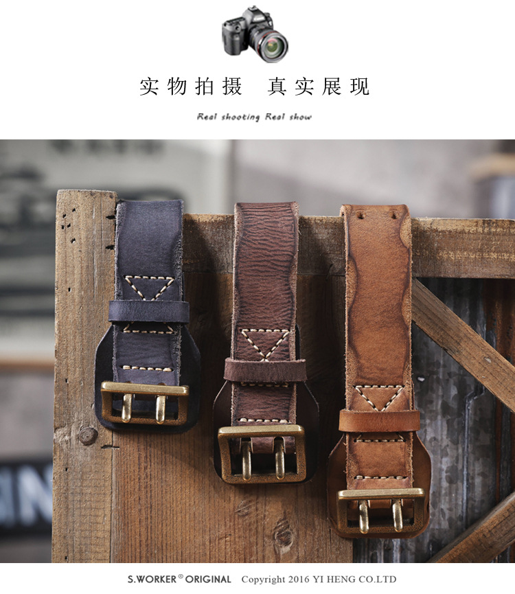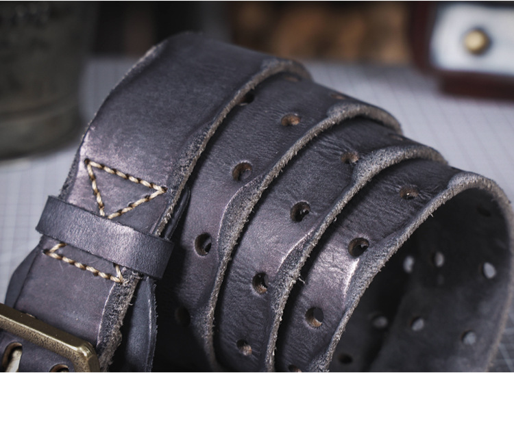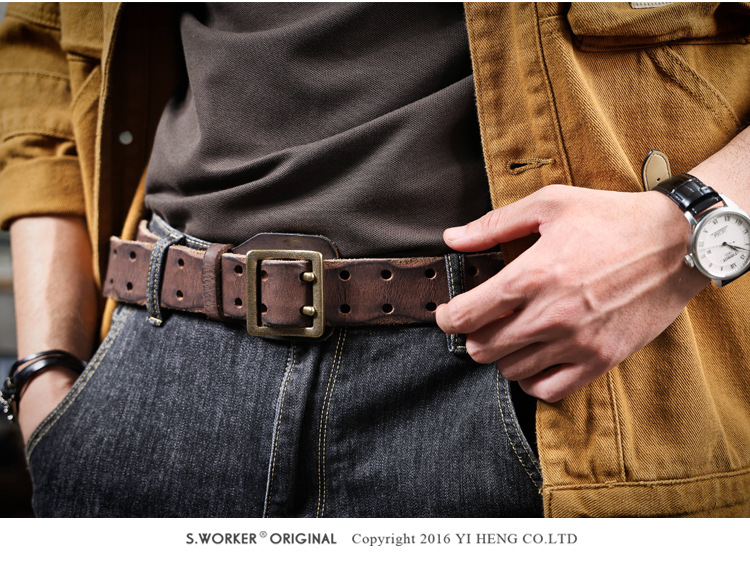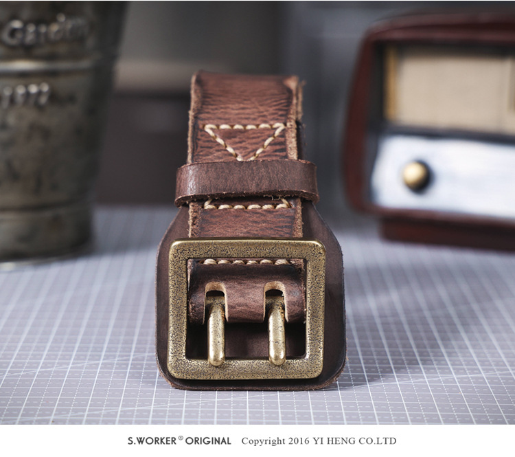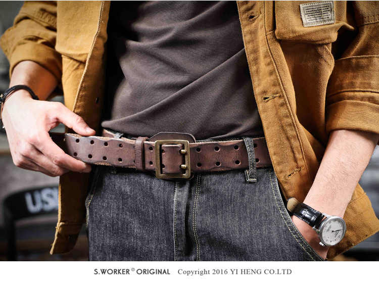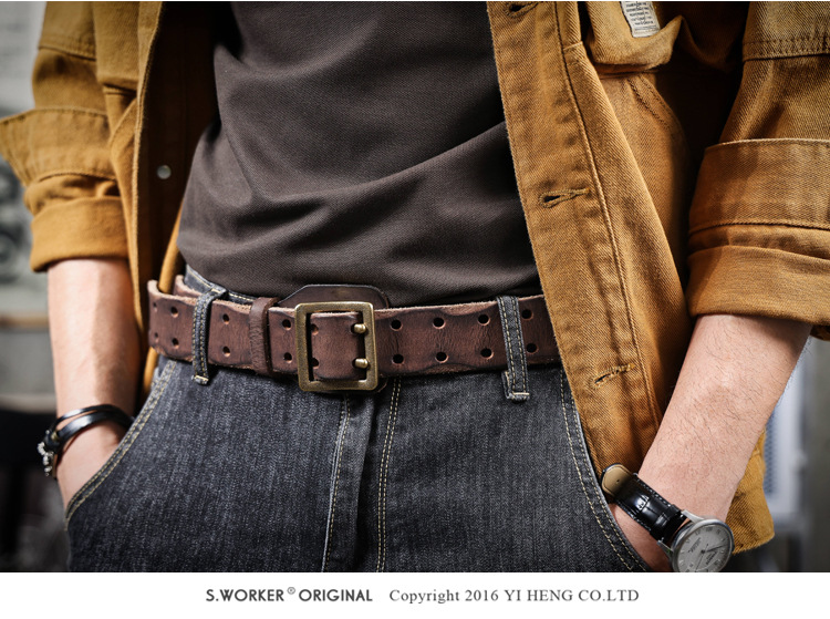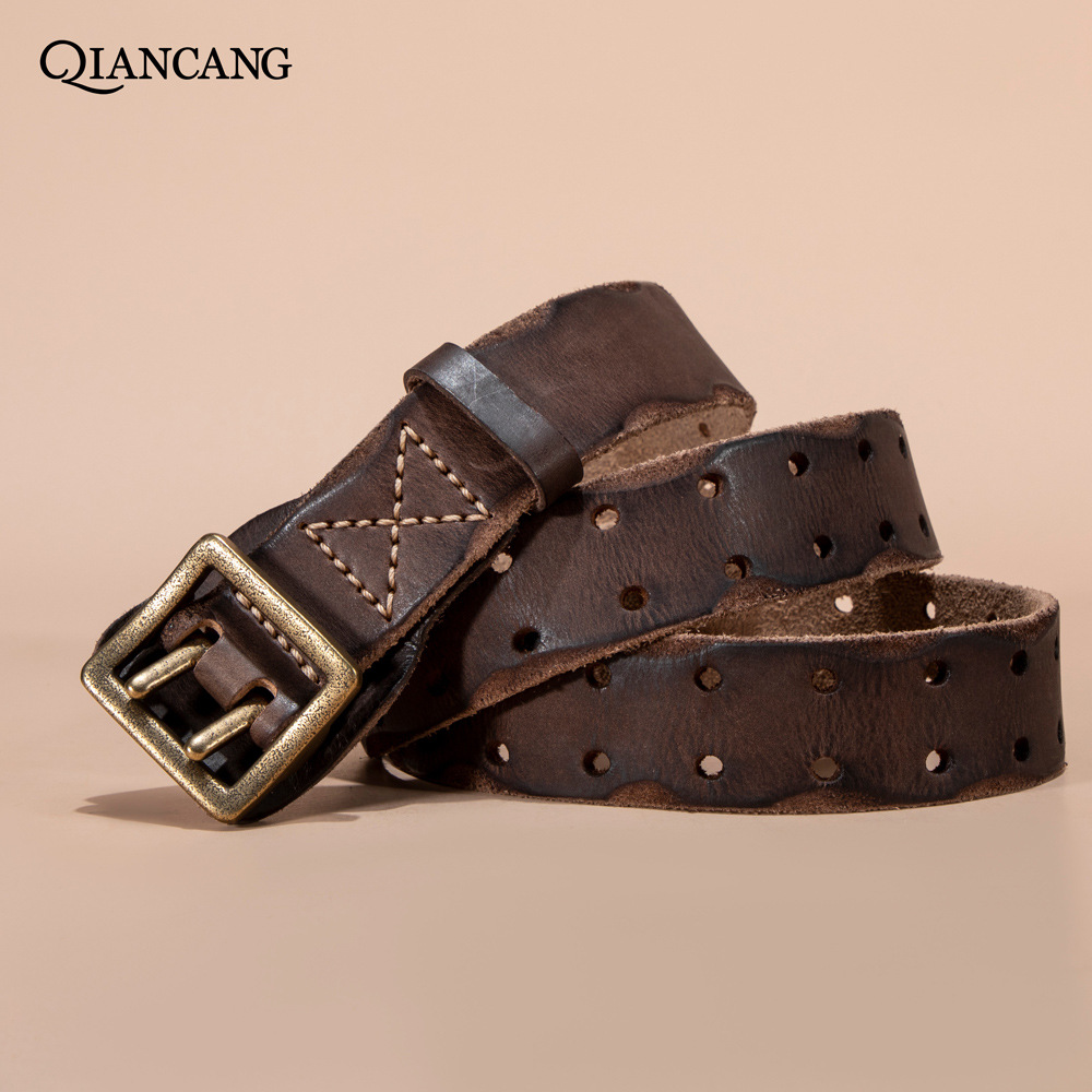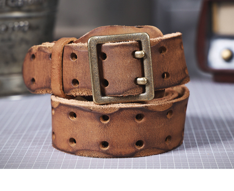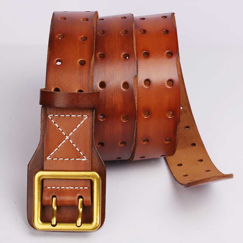 アメリカの厚いトップ層牛革男性銅ベルト双針ボタン復古手作りイタリア真皮ベルトシンプル