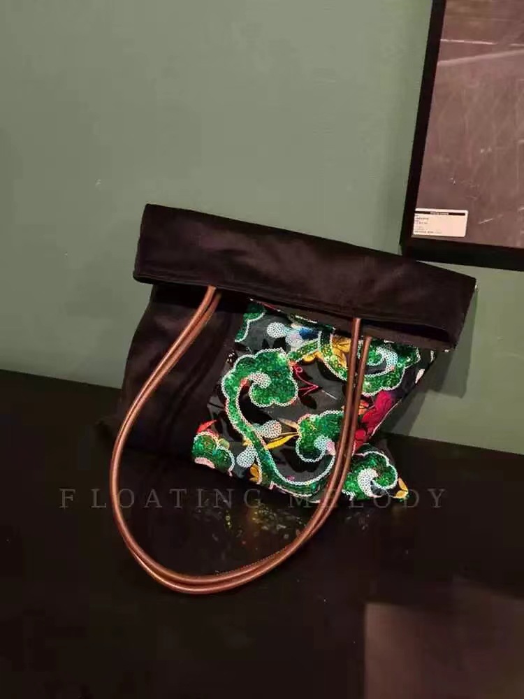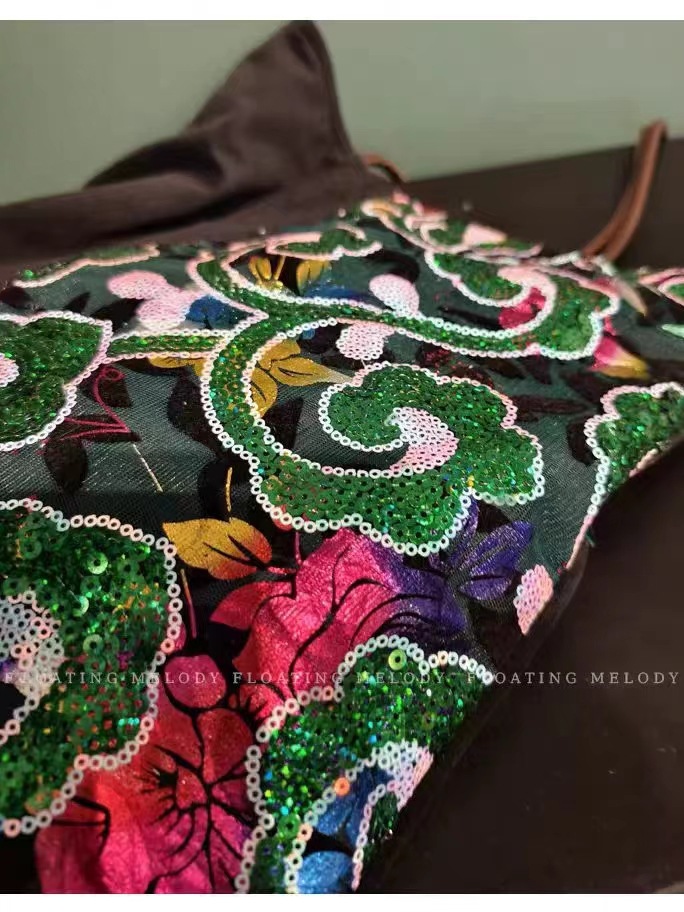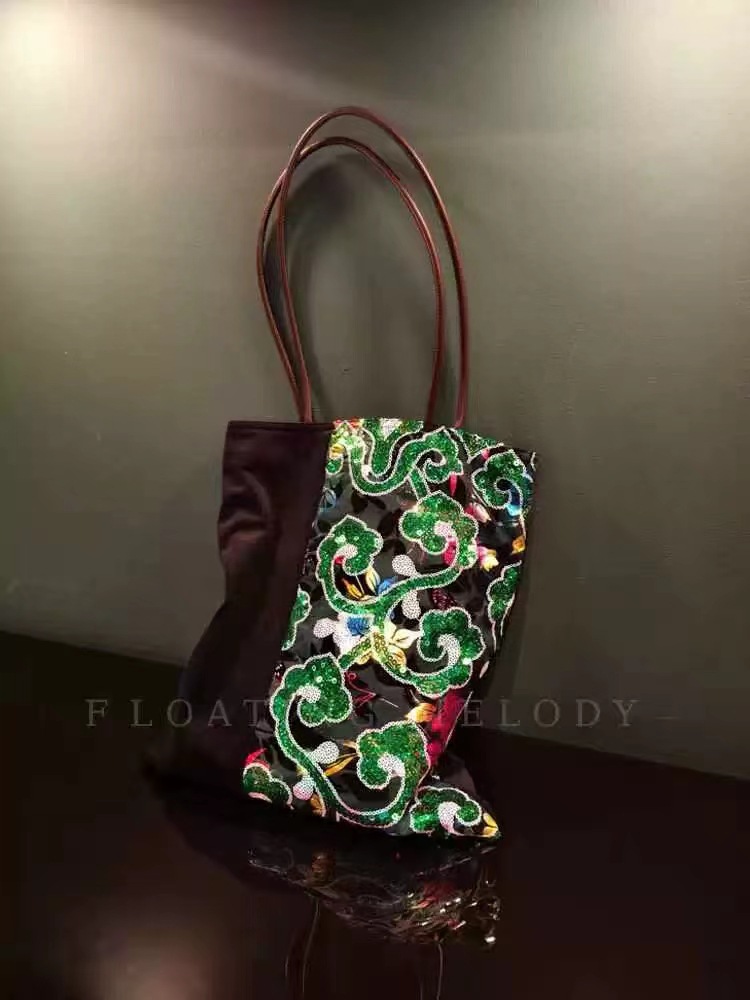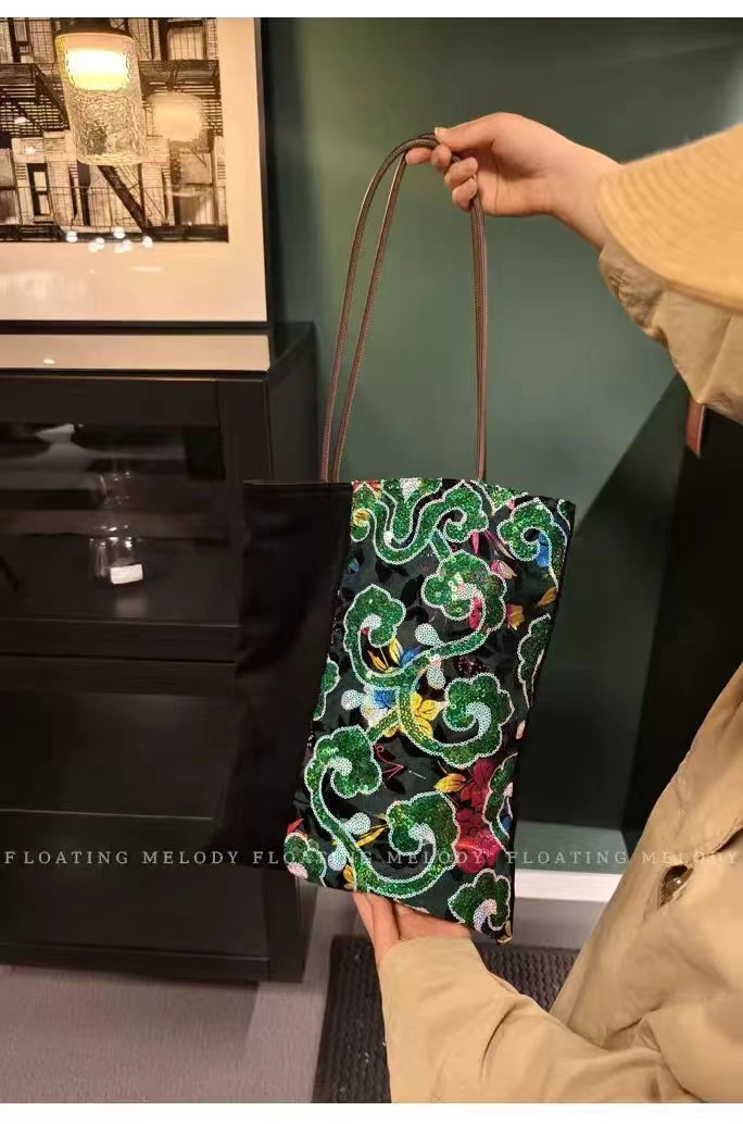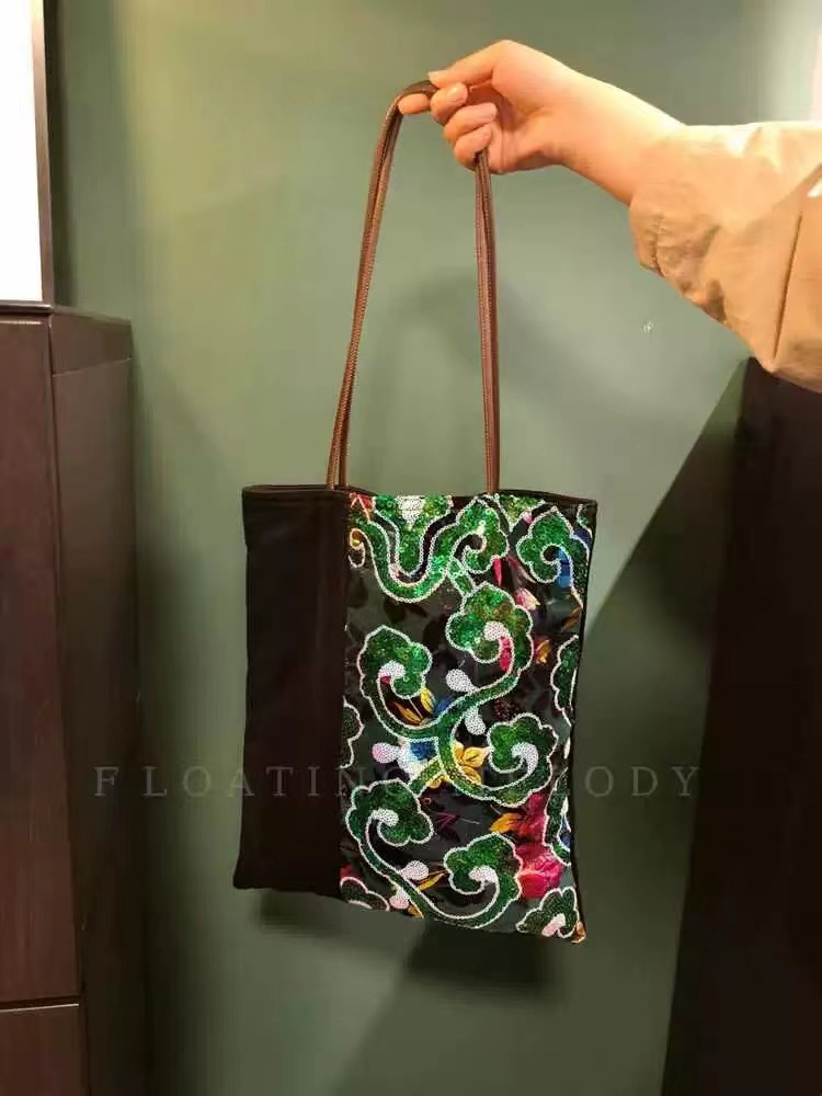 古着感ヴィンテージグリーン祥雲スパンコールベルベットステッチシングルショルダーバッグ特包浮月笙オリジナル新商品