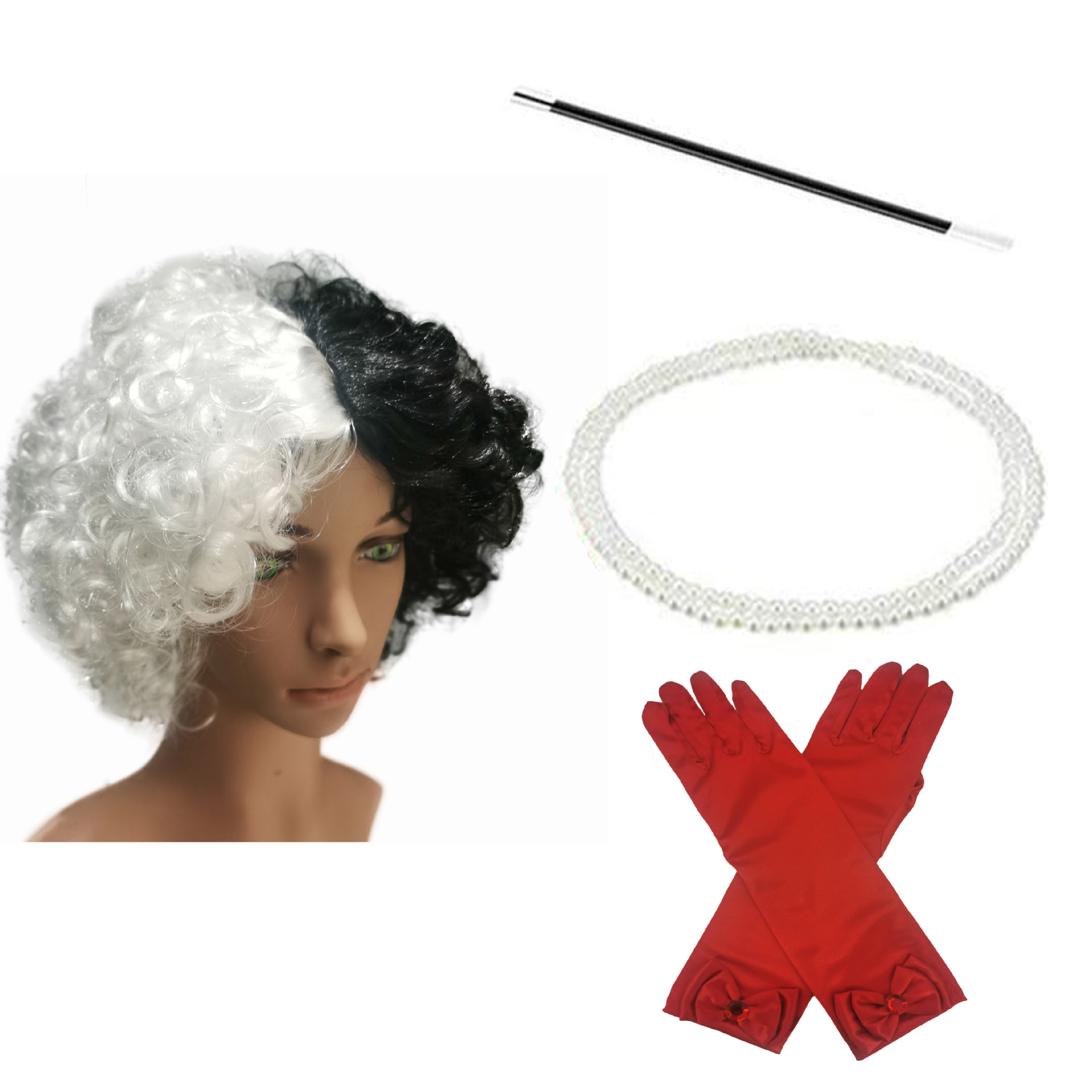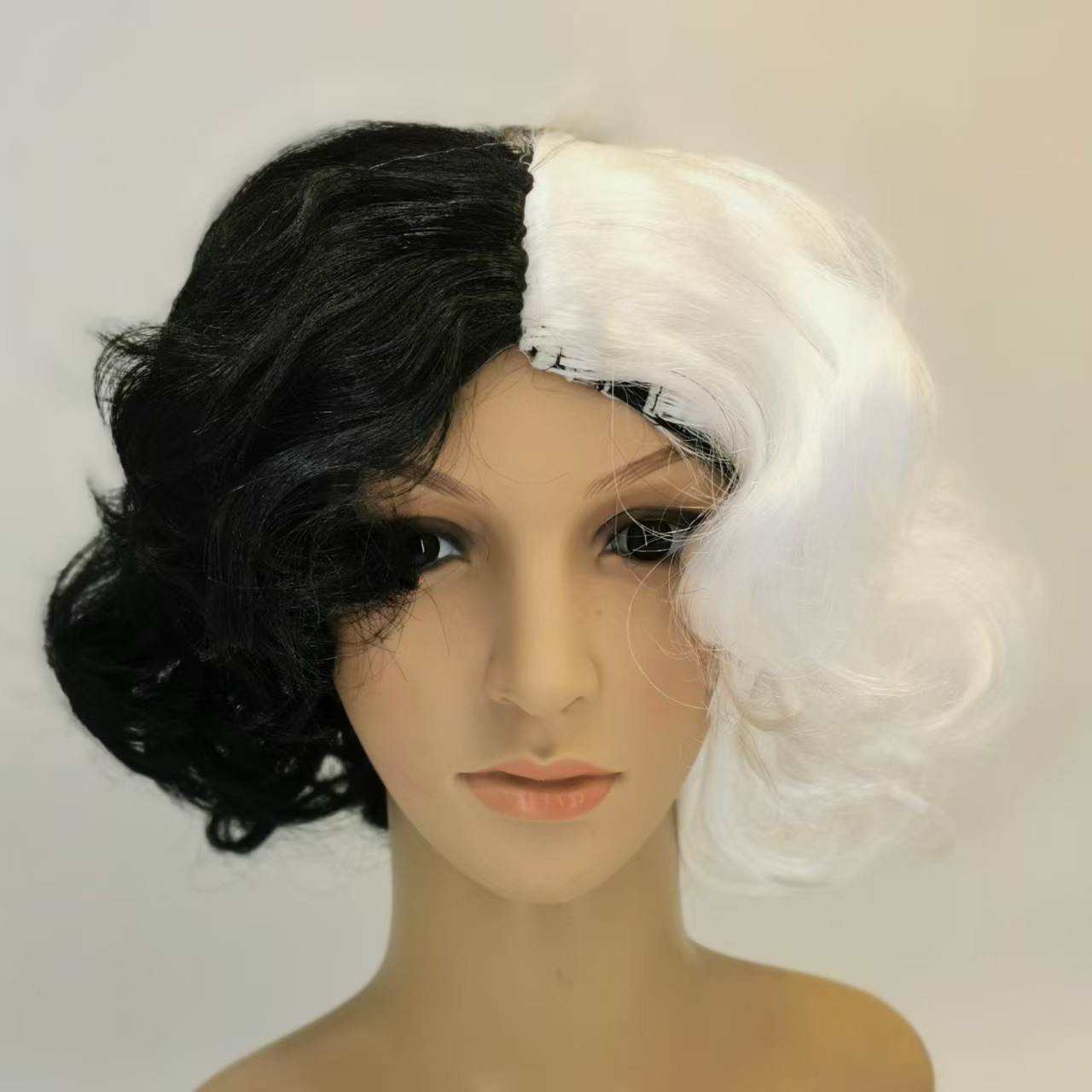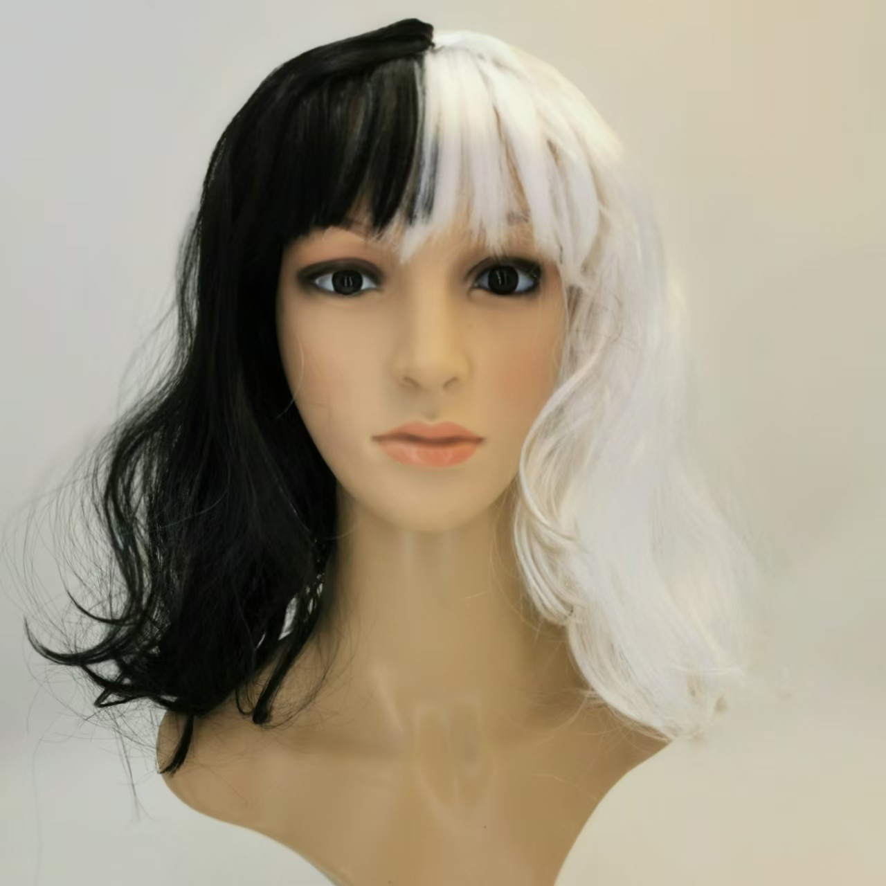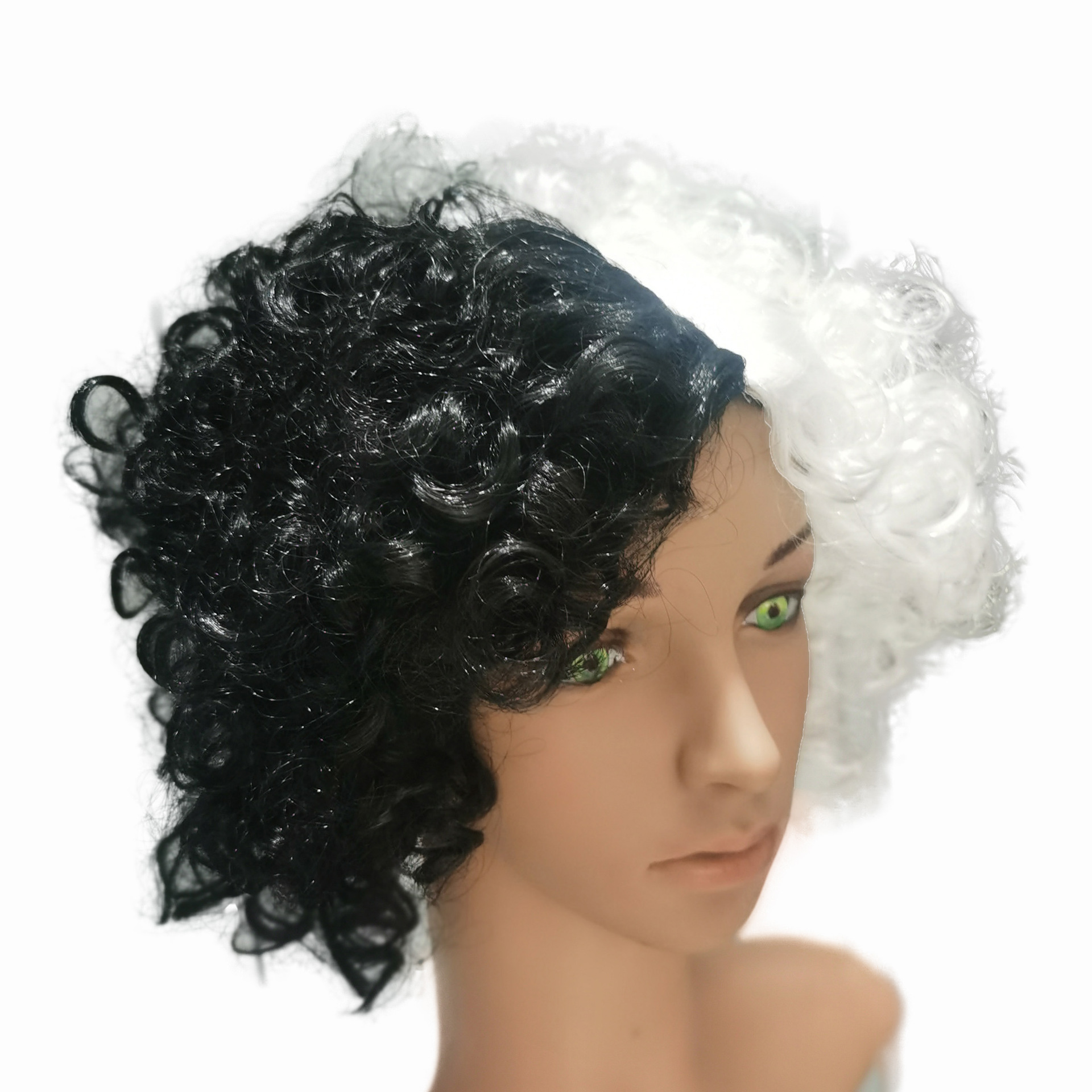 ハロウィーンcosアニメかつらパーティーコスチューム黒と白の魔女クイエラ黒と白のかつらミディアムロングかつら