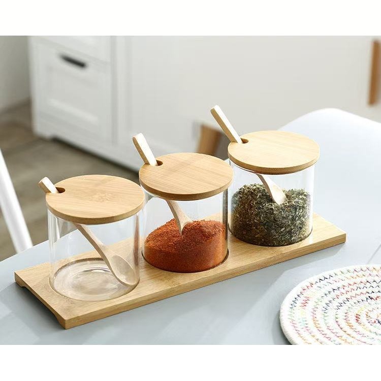 ガラス調味料缶セット木スプーン蓋付き家庭用キッチン鶏精塩調味料瓶ガラスセット調味料瓶缶