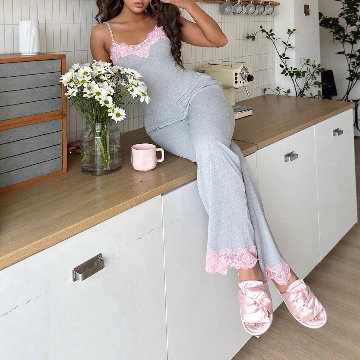 跨境欧美新款粉色蕾丝ins家居服套装灰色吊带长裤舒适显身材睡衣