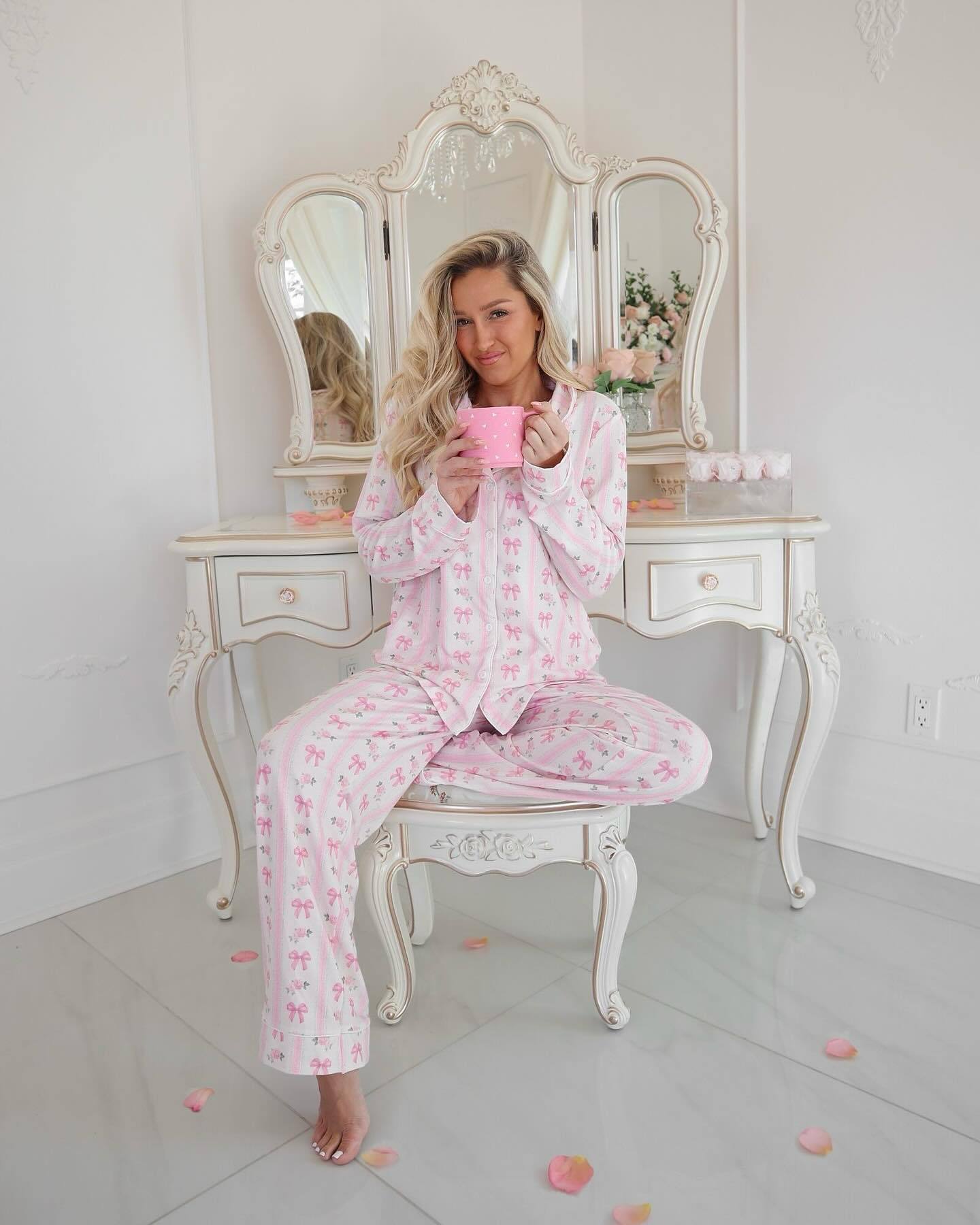 2025秋季新跨境独立站时尚蝴蝶结印花套装长袖长裤开衫家居服套装