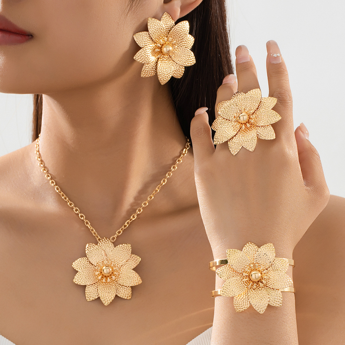 1套欧美跨境时尚夸张那个花朵金属金色首饰套装适合女士度假佩戴