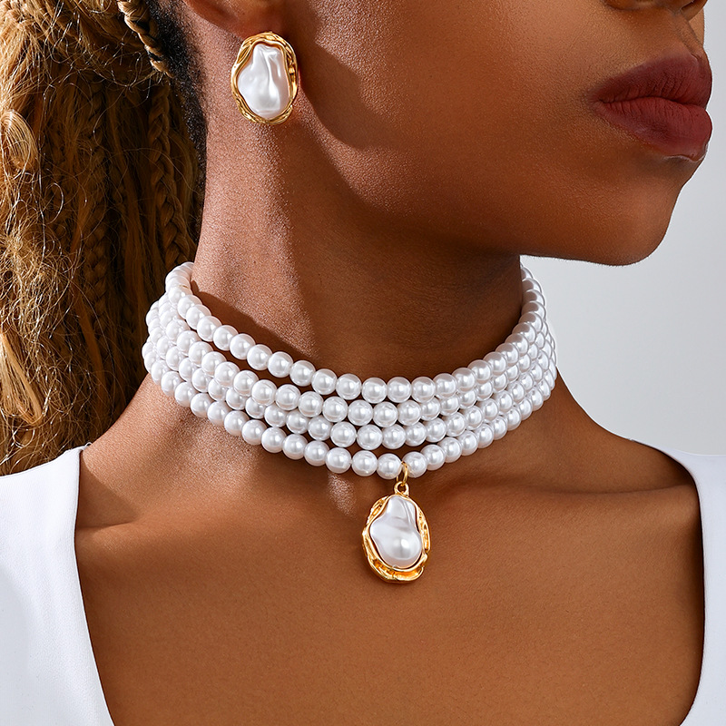 1セットの欧米の華麗な宴会の風の金属の異形は真珠の多層をまねて女性のネックレスのイヤリングのアクセサリーのスーツをかぶせます。