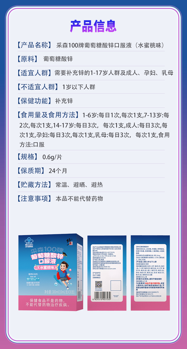 修正採森100ブランドのグルコン酸亜鉛児童妊婦成人補亜鉛水蜜桃味経口液代発