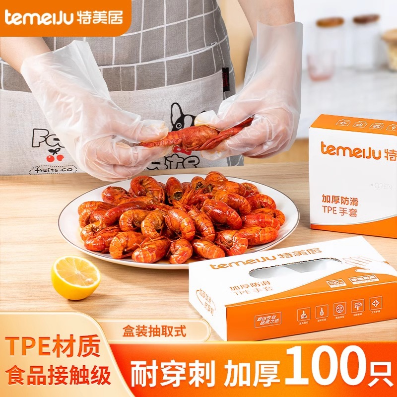 卸売 Temeiju 使い捨て手袋 TPE 高弾性キッチン家庭用大型厚みのあるテイクアウト特別な商業透明