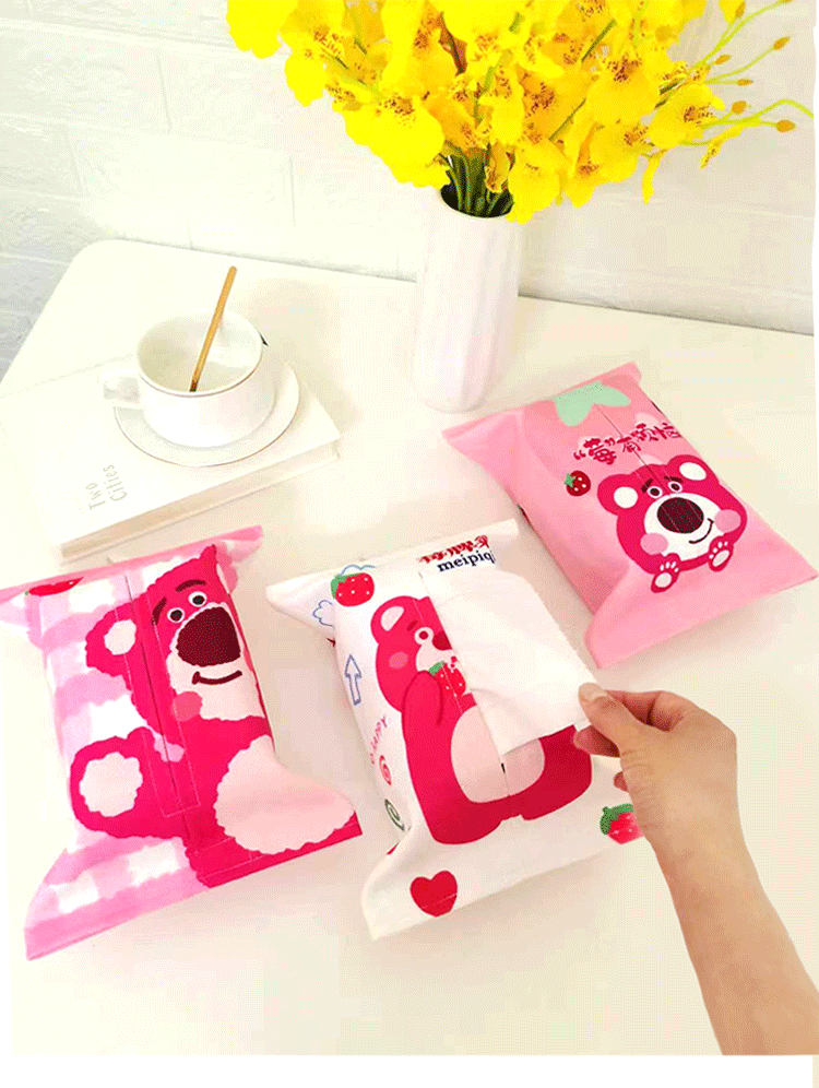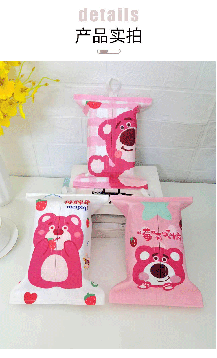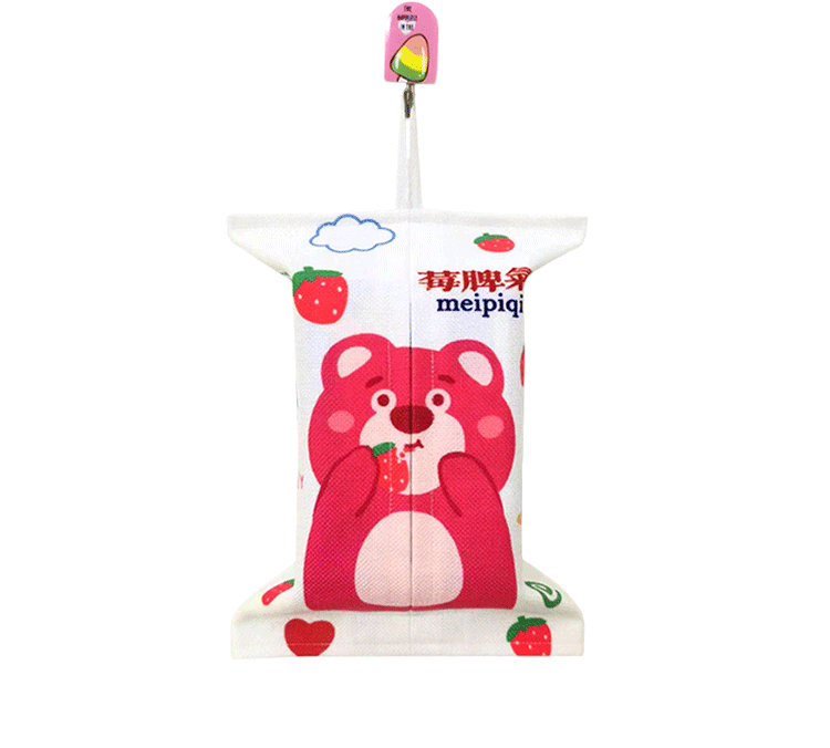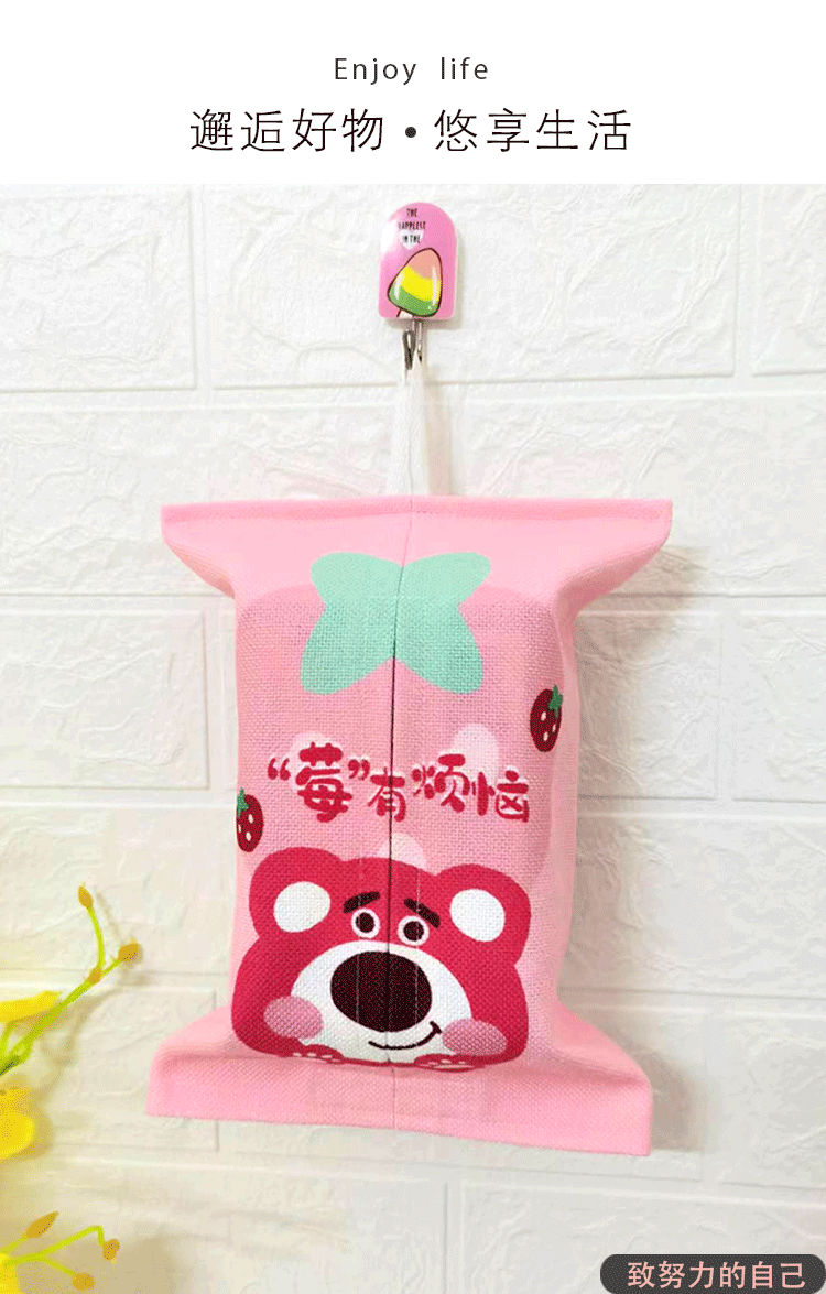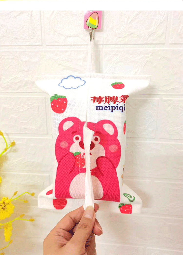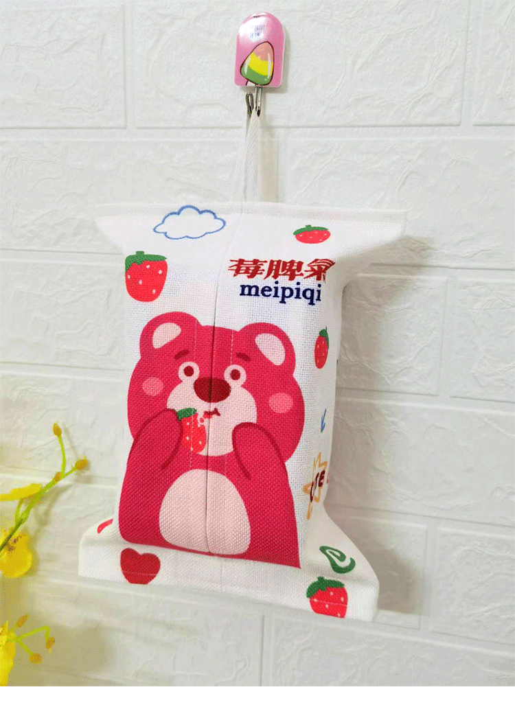 吊り下げ式ティッシュバッグ、キュートで楽しいイチゴクマ柄ティッシュバッグ、リビングやキッチン用、布製コットン麻素材、印刷可能なティッシュボックス