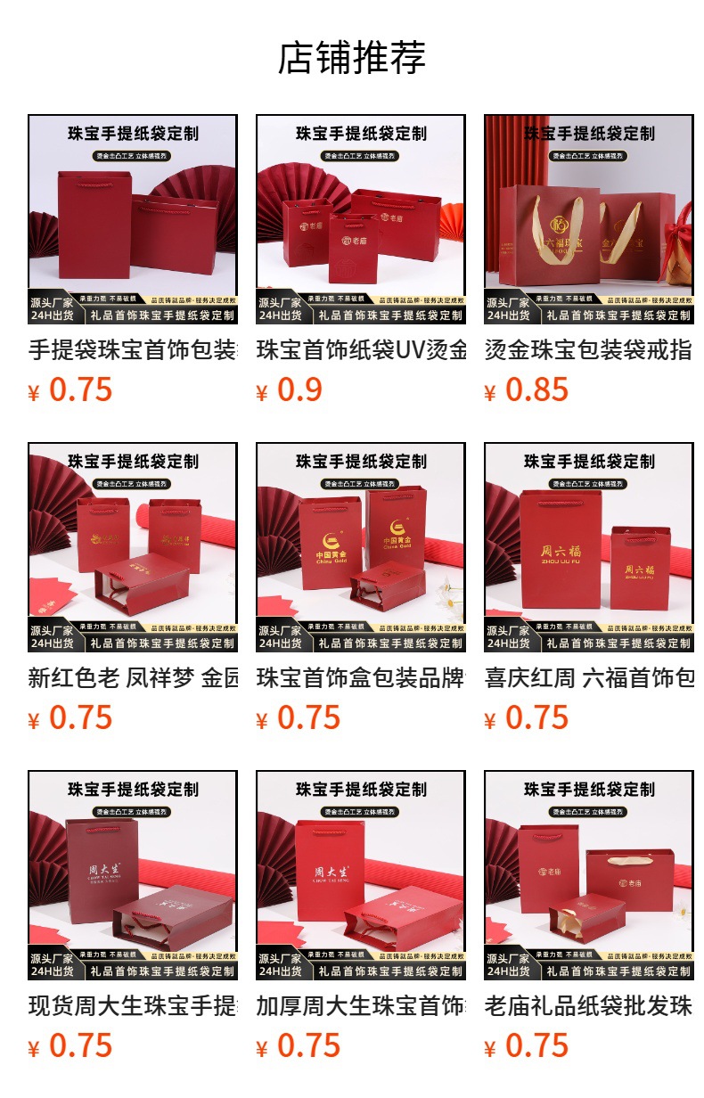 周大福風ジュエリー包装紙袋、指輪、ペンダント、ブレスレット、ギフトバッグ、金ジュエリー用紙袋