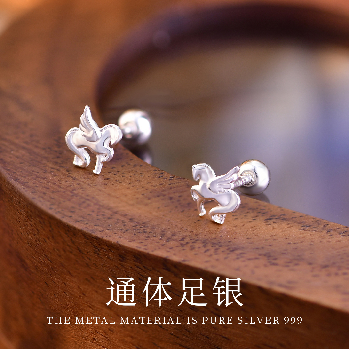 S999足银简约小马耳钉女2025年新款潮小巧精致耳骨钉拧螺丝耳钉饰