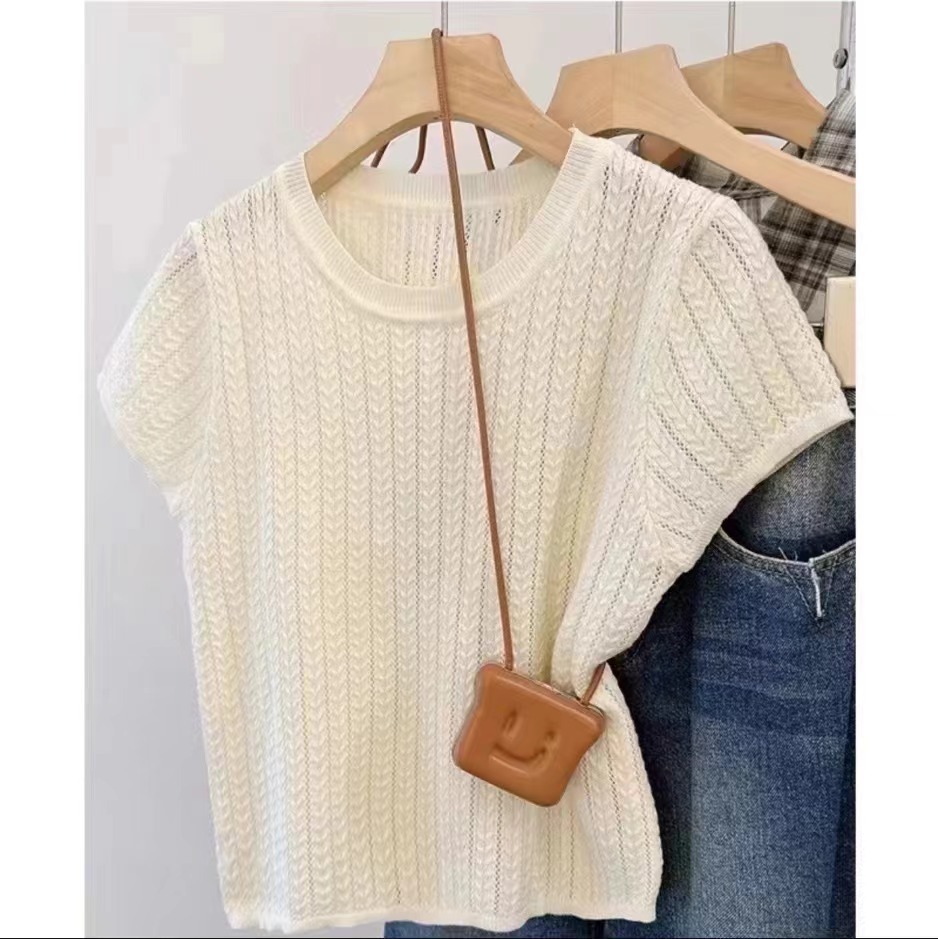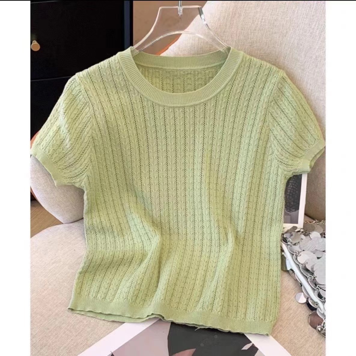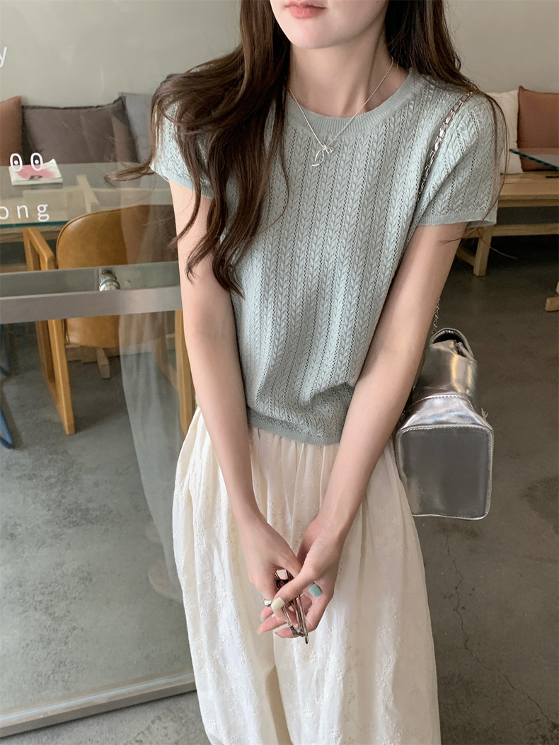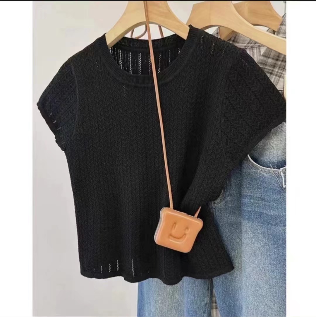 ニットの女性の半袖2024春の夏の新しい丸首の透かし彫りの薄いショートタイプの底のデザイン感の純色の上着