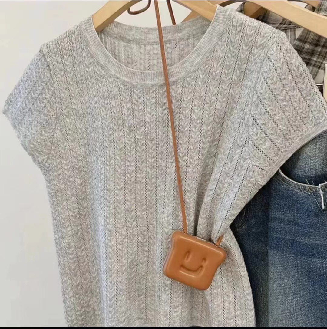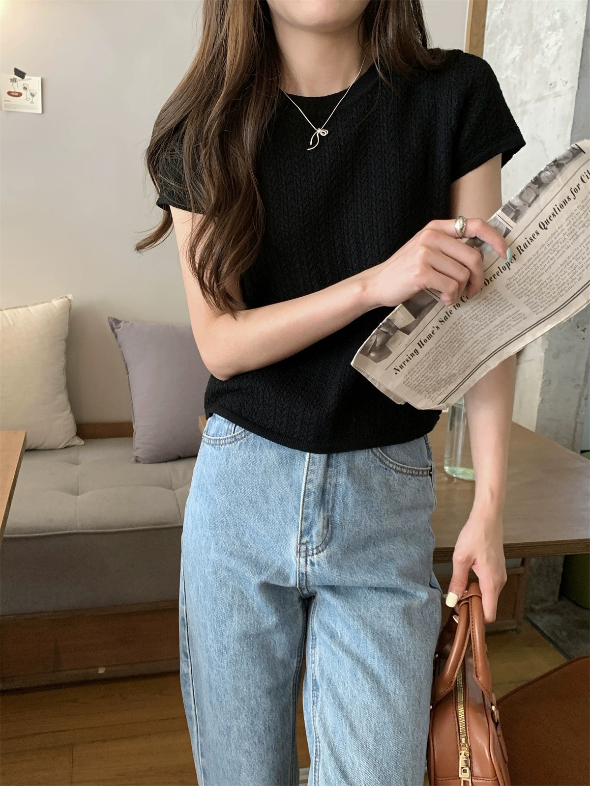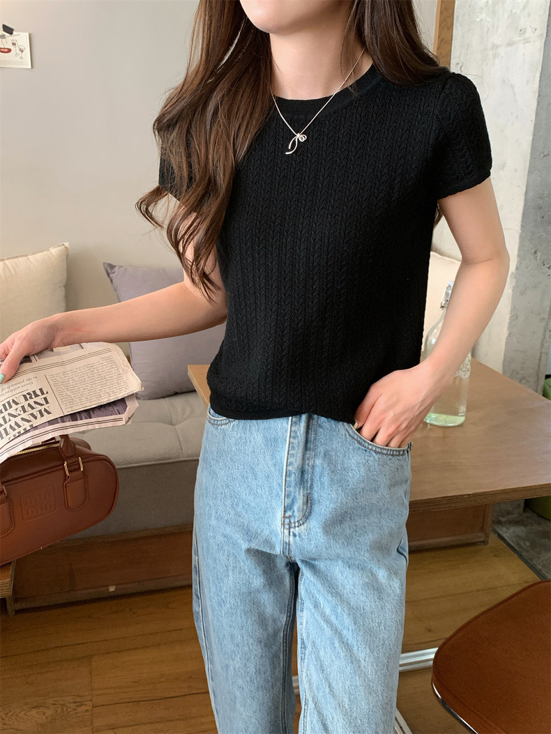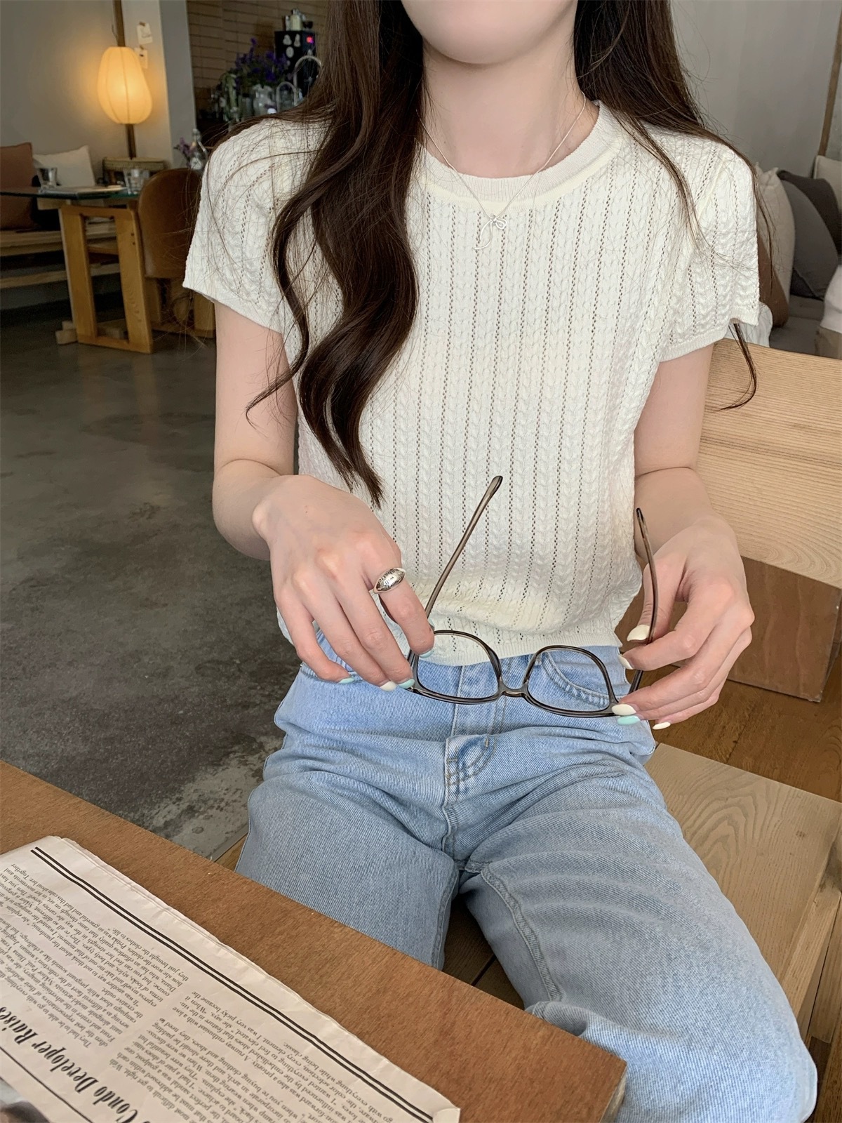 ニットの女性の半袖2024春の夏の新しい丸首の透かし彫りの薄いショートタイプの底のデザイン感の純色の上着