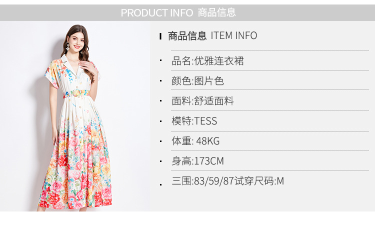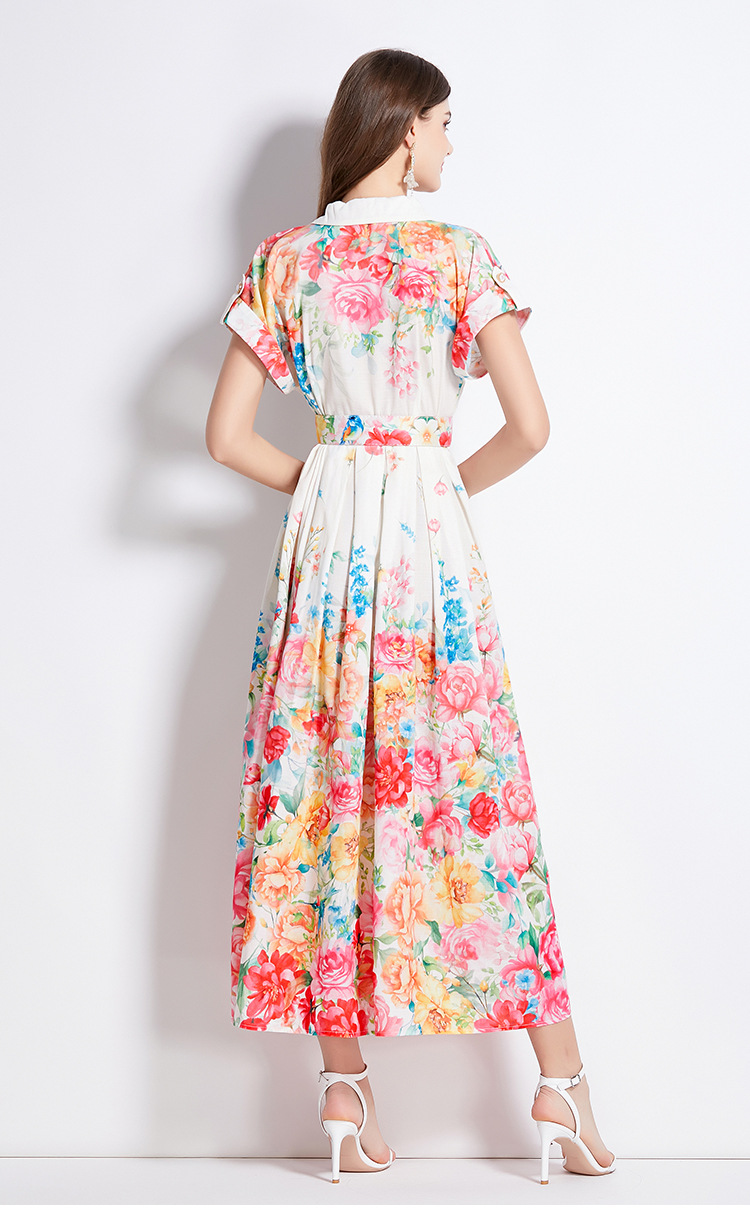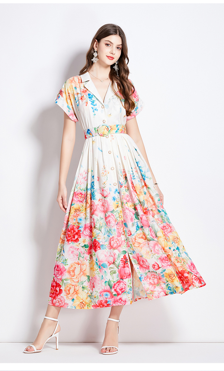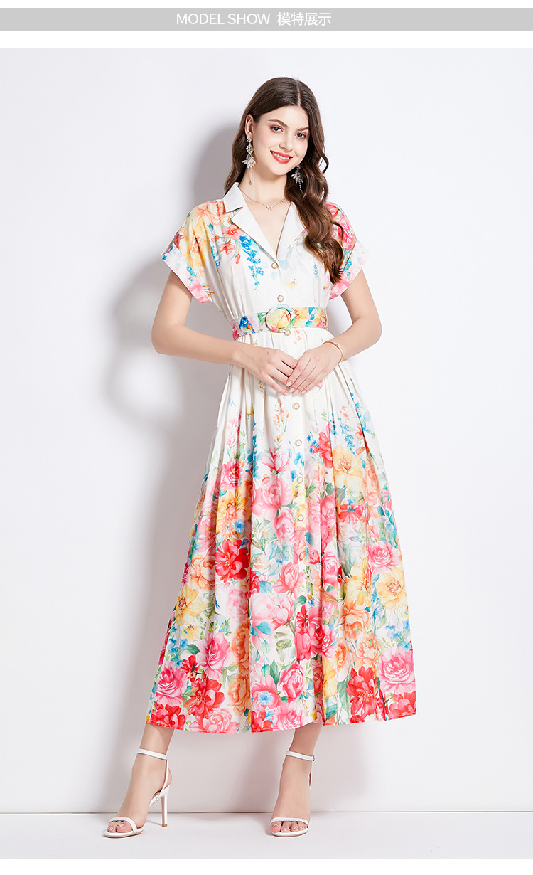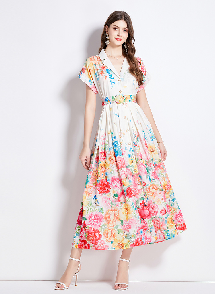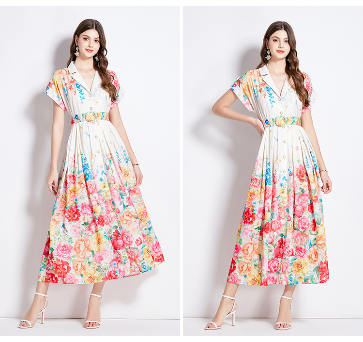欧米のレトロなワンピースの女性の夏服の新型の名媛の気質は腰の単列を収めて襟のプリントの中の長いタイプのドレスをひっくり返します。